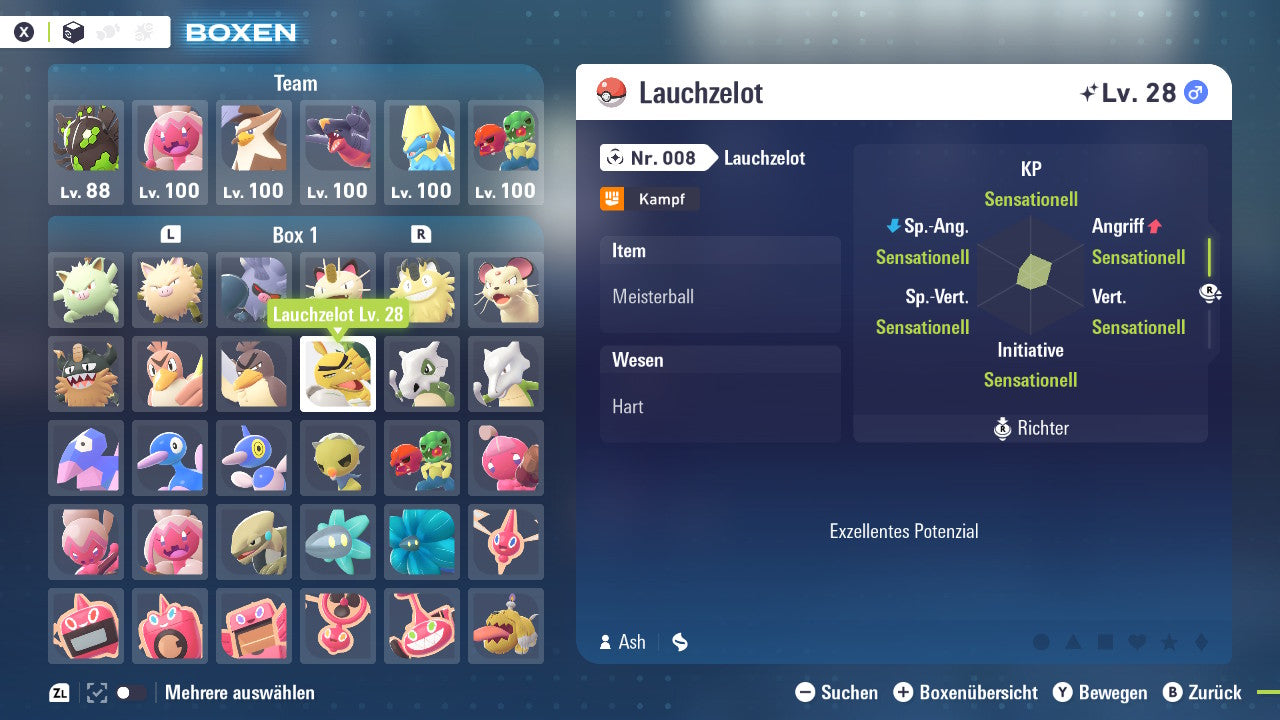 Das Pokemon ist mit beeindruckenden 6×31 IV-Werten ausgestattet. Das bedeutet, dass es auf allen sechs Werten (KP, Ang., Sp-Ang., Vert., Sp-Vert., Init.) die maximalen 31 IV/DV-Punkte besitzt. Dein Pokemon startet somit mit herausragender Stärke in digitale Kämpfe.