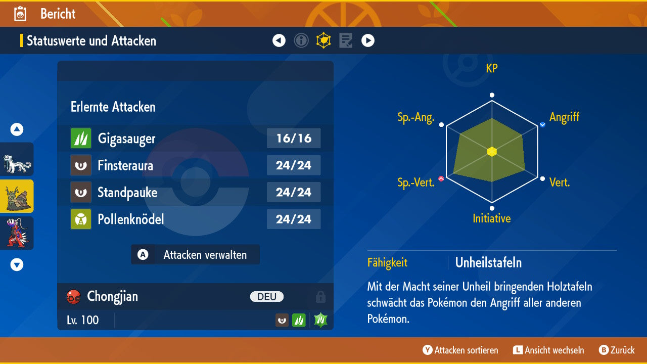 The Pokemon is equipped with impressive 6x31 IV values. This means that it has the maximum 31 IV/DV points for all six values (HP, Atk, Sp-Atk, Def, Sp-Def, Init). Your Pokemon therefore starts digital battles with outstanding strength.