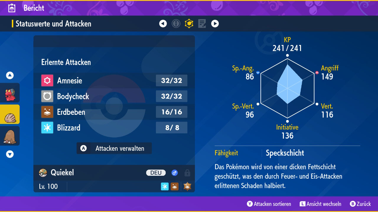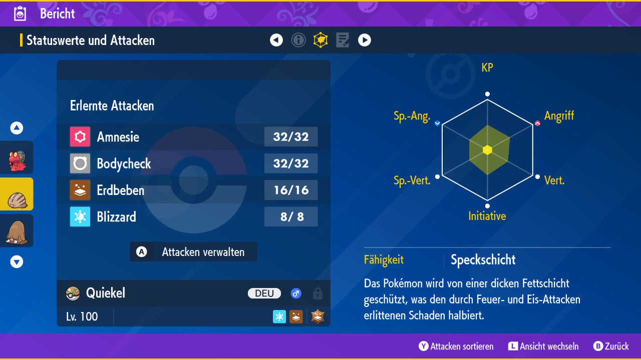 The Pokemon is equipped with impressive 6x31 IV values. This means that it has the maximum 31 IV/DV points for all six values (HP, Atk, Sp-Atk, Def, Sp-Def, Init). Your Pokemon therefore starts digital battles with outstanding strength.