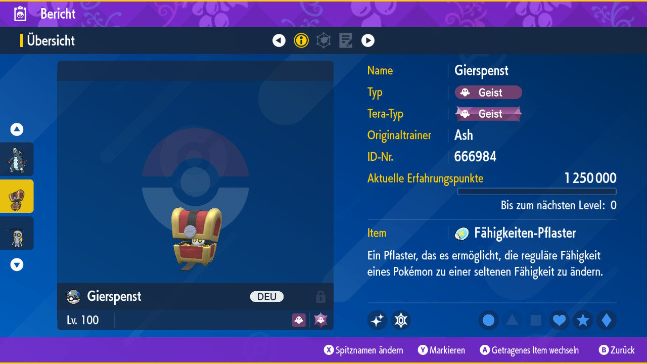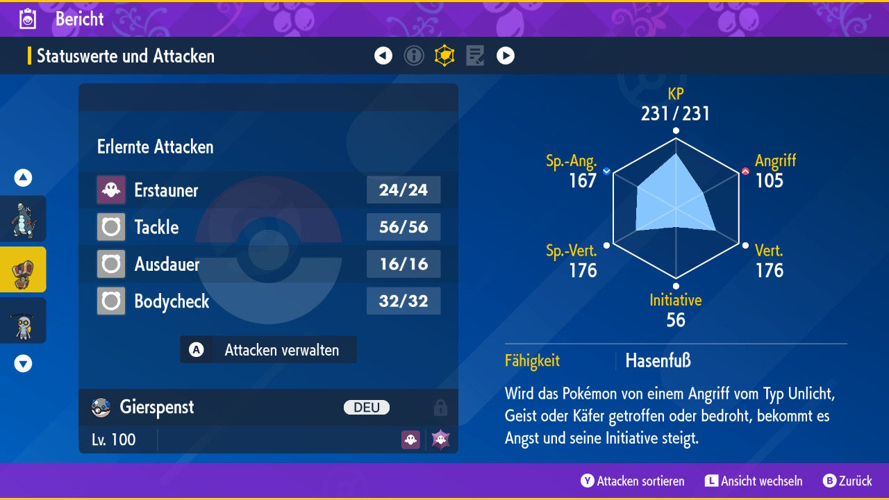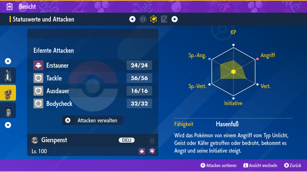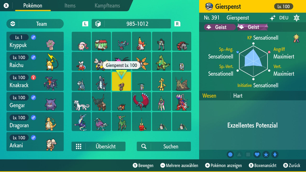 The Pokemon is equipped with impressive 6x31 IV values. This means that it has the maximum 31 IV/DV points for all six values (HP, Atk, Sp-Atk, Def, Sp-Def, Init). Your Pokemon therefore starts digital battles with outstanding strength.