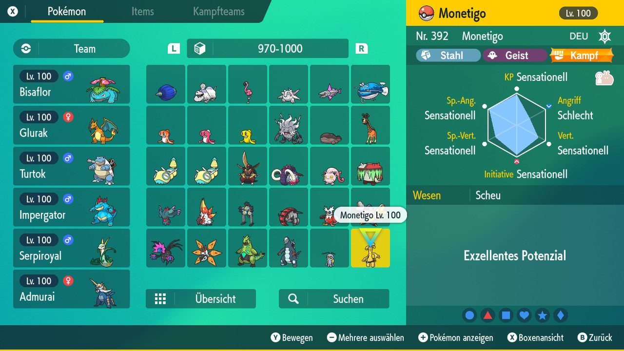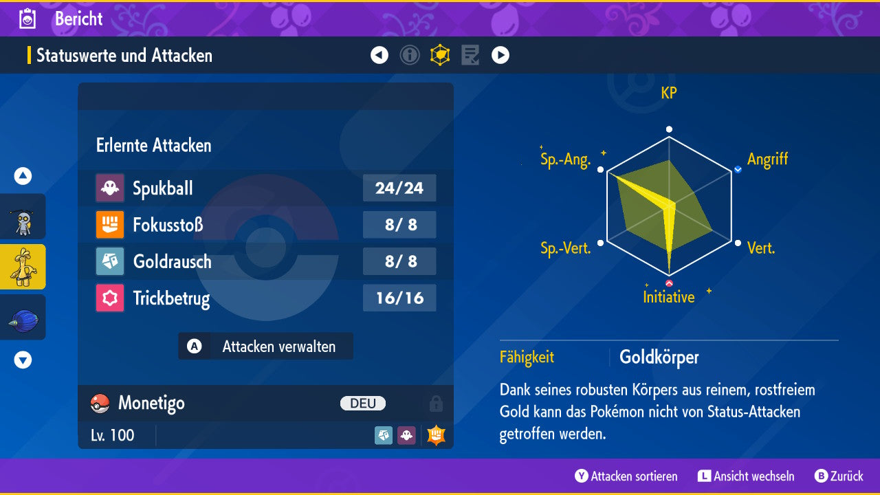 The Pokemon is equipped with impressive 6x31 IV values. This means that it has the maximum 31 IV/DV points for all six values (HP, Atk, Sp-Atk, Def, Sp-Def, Init). Your Pokemon therefore starts digital battles with outstanding strength.