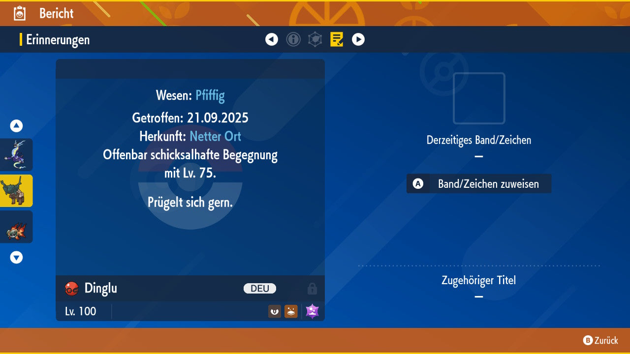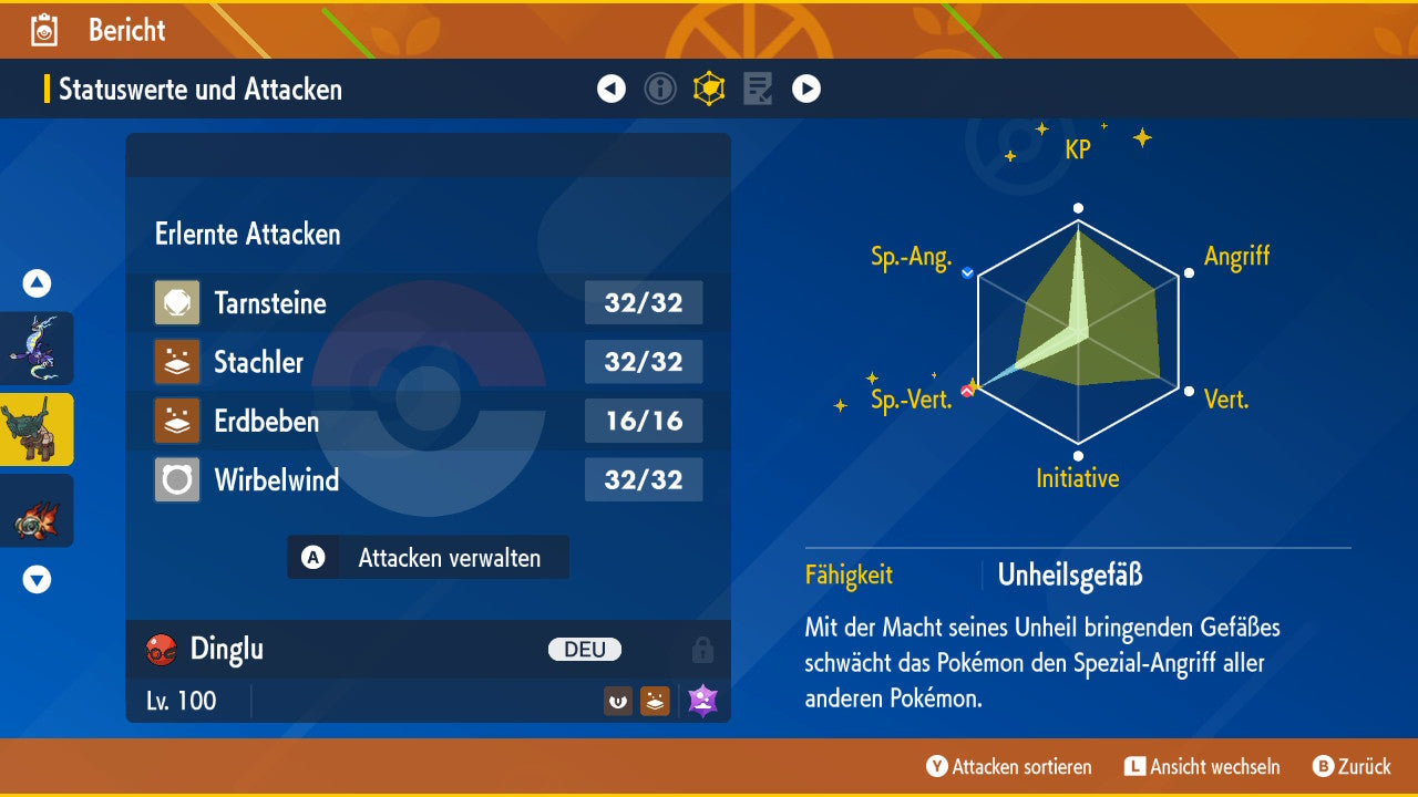The Pokemon is equipped with impressive 6x31 IV values. This means that it has the maximum 31 IV/DV points for all six values (HP, Atk, Sp-Atk, Def, Sp-Def, Init). Your Pokemon therefore starts digital battles with outstanding strength.