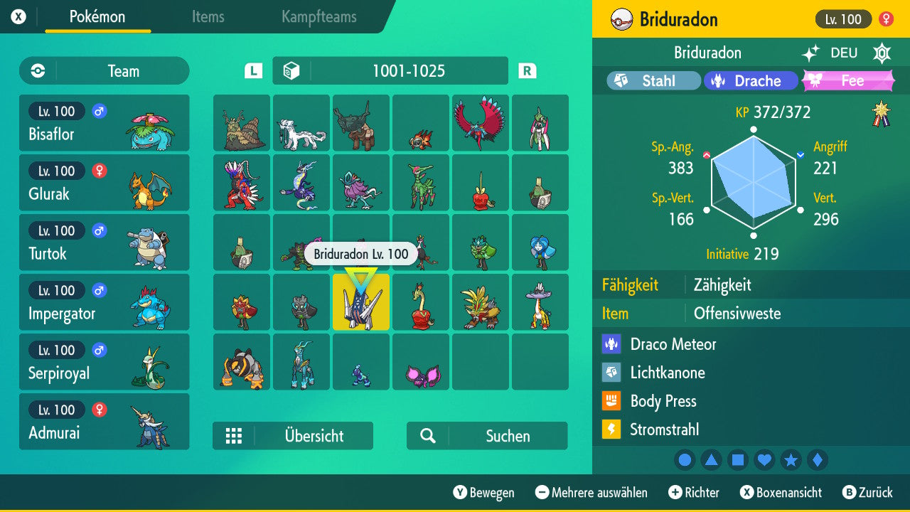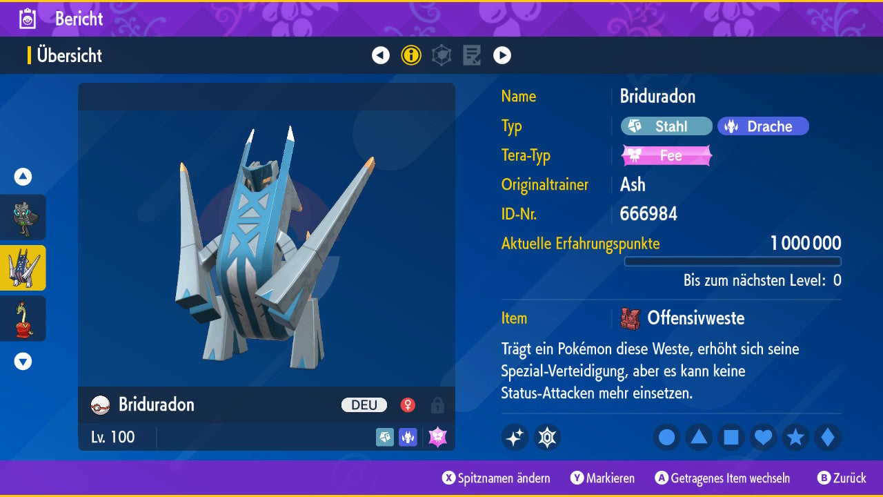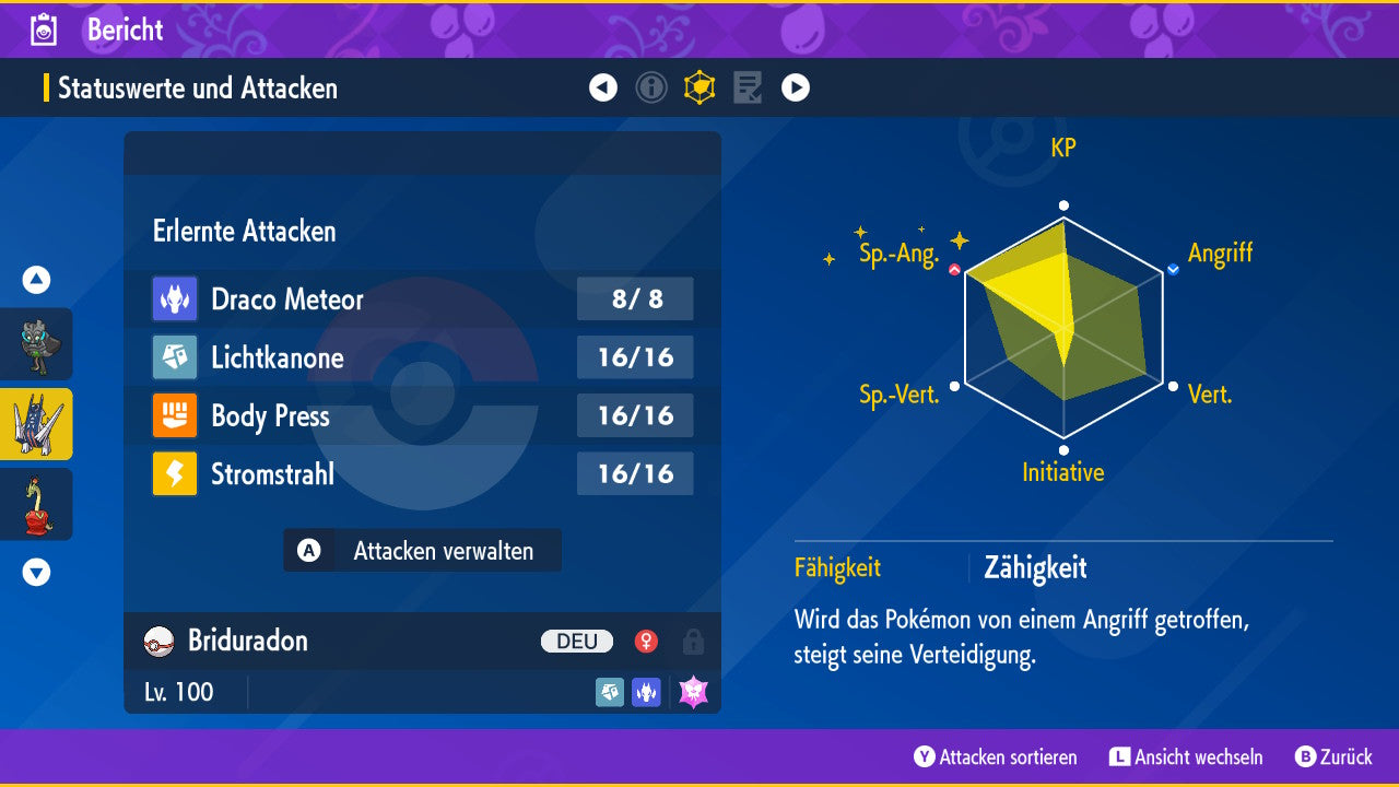 The Pokemon is equipped with impressive 6x31 IV values. This means that it has the maximum 31 IV/DV points for all six values (HP, Atk, Sp-Atk, Def, Sp-Def, Init). Your Pokemon therefore starts digital battles with outstanding strength.