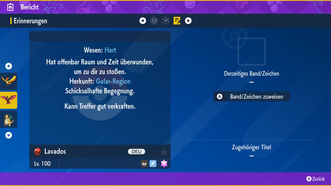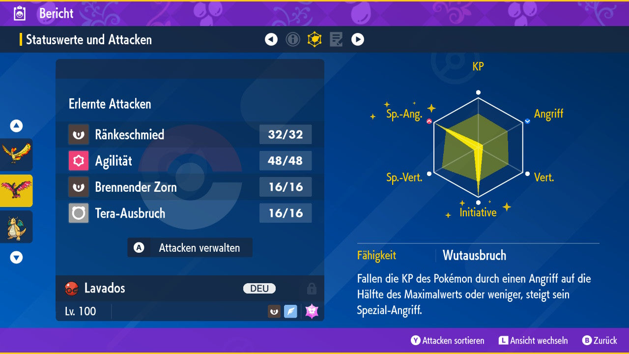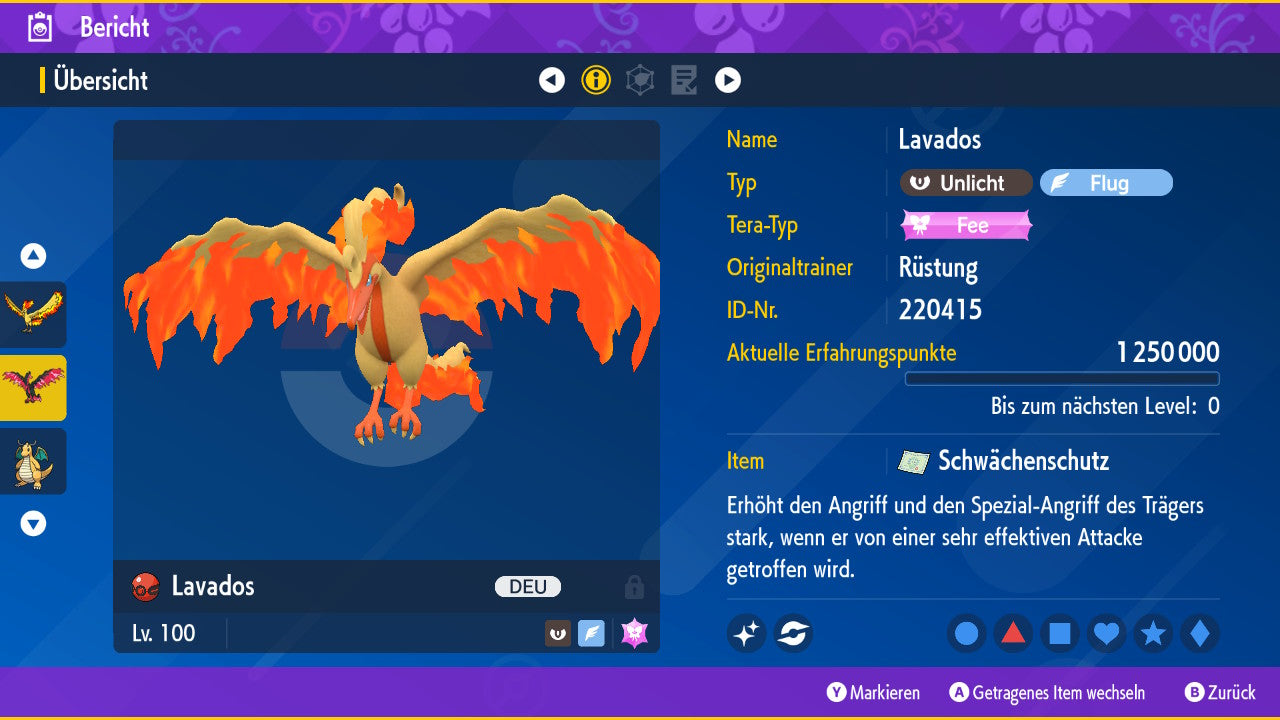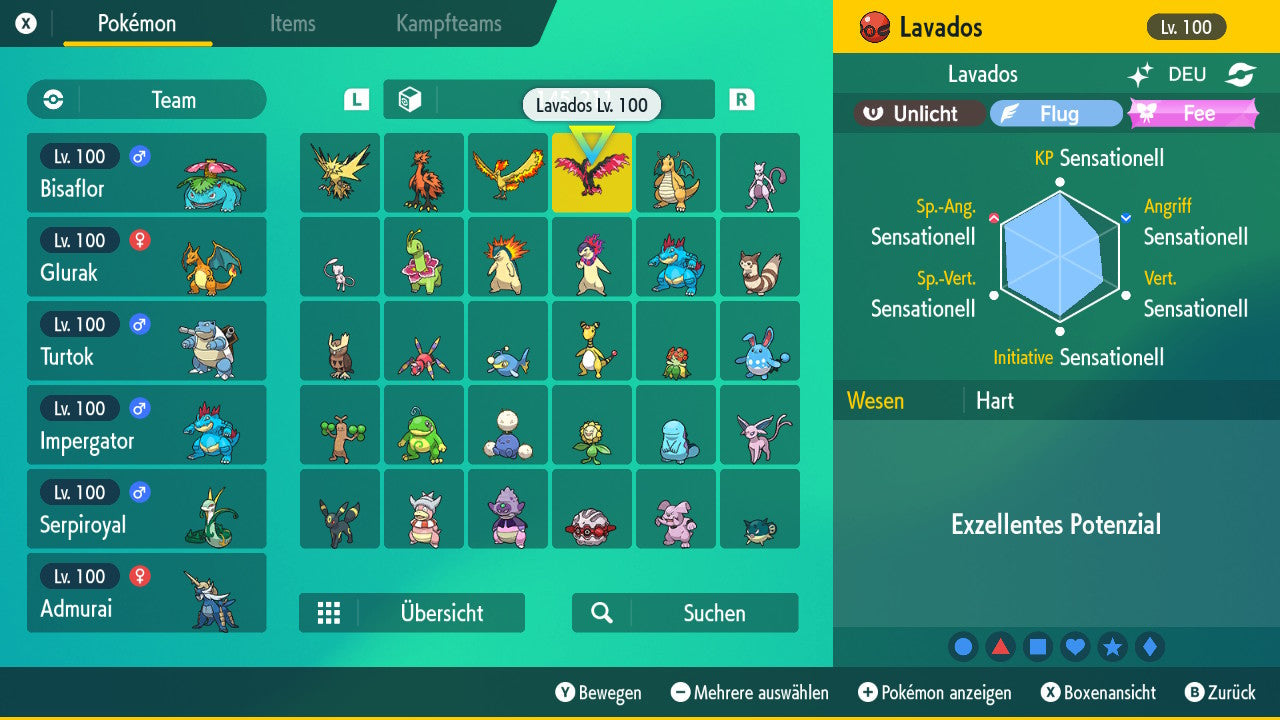 The Pokemon is equipped with impressive 6x31 IV values. This means that it has the maximum 31 IV/DV points for all six values (HP, Atk, Sp-Atk, Def, Sp-Def, Init). Your Pokemon therefore starts digital battles with outstanding strength.