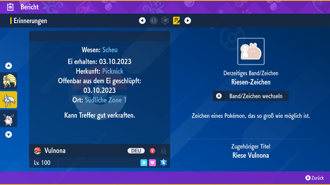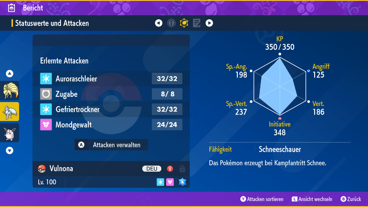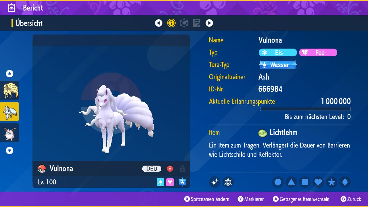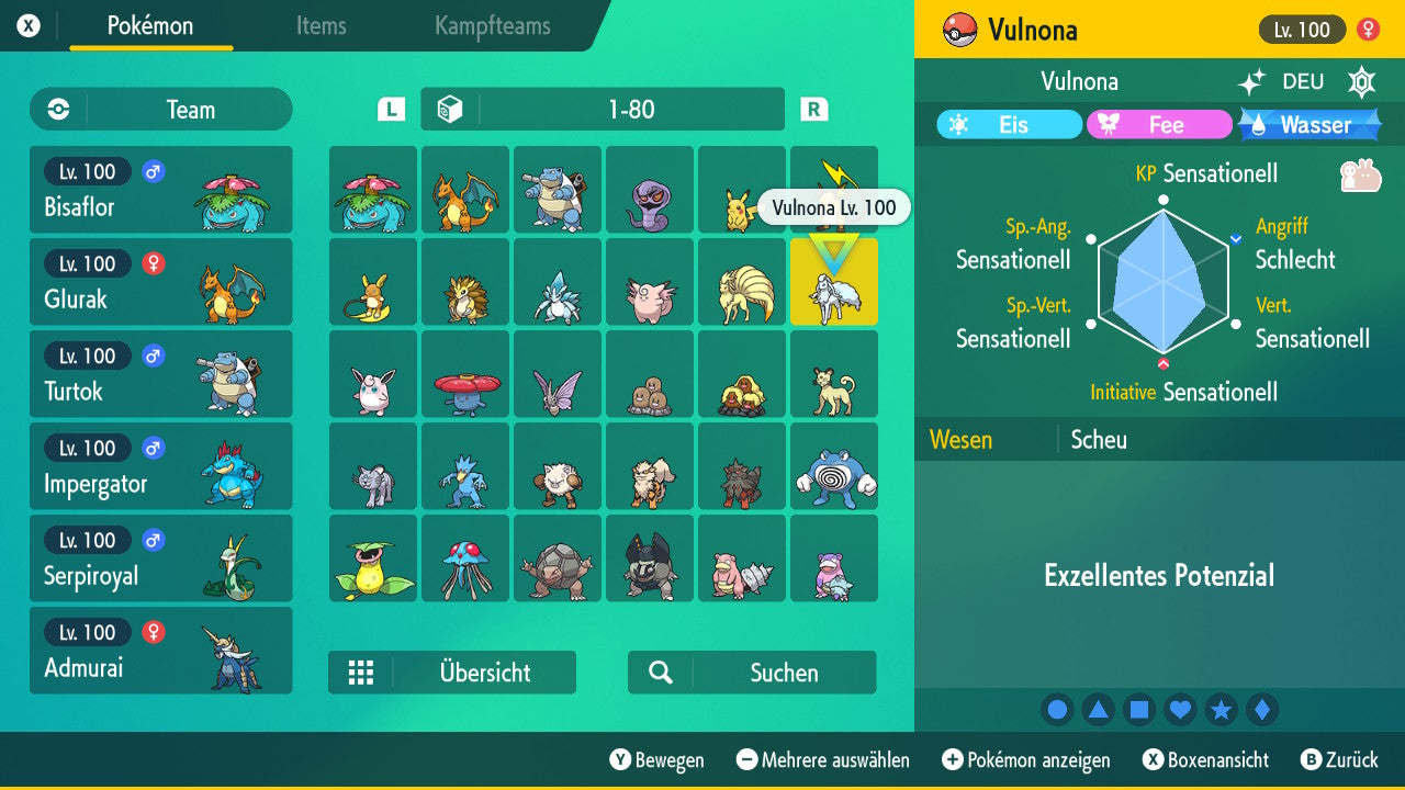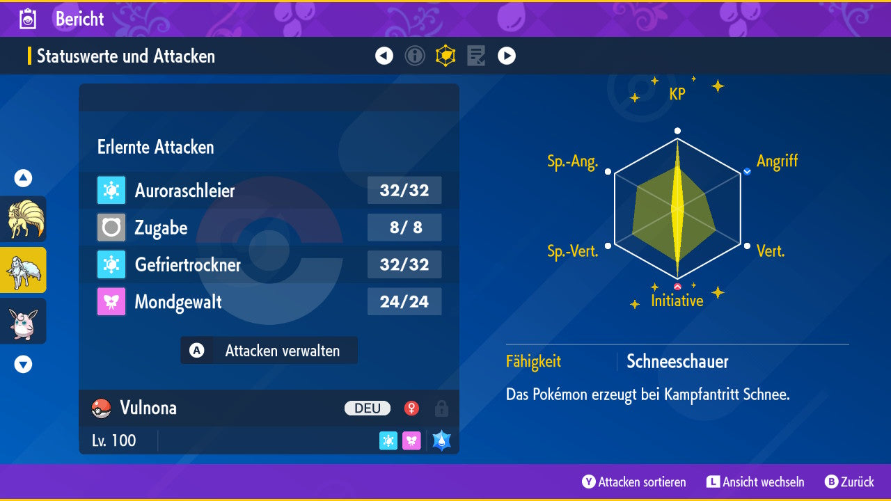 The Pokemon is equipped with impressive 6x31 IV values. This means that it has the maximum 31 IV/DV points for all six values (HP, Atk, Sp-Atk, Def, Sp-Def, Init). Your Pokemon therefore starts digital battles with outstanding strength.