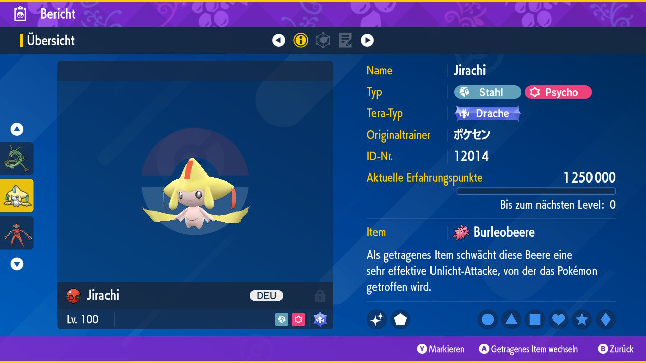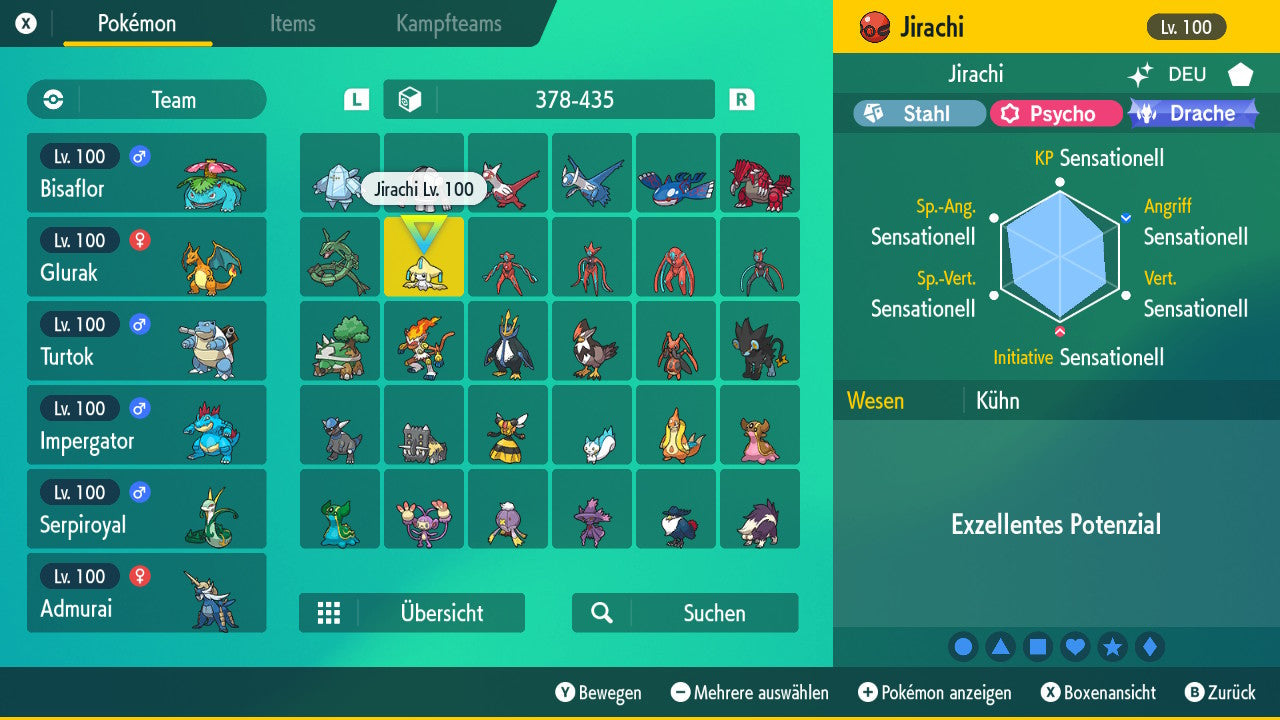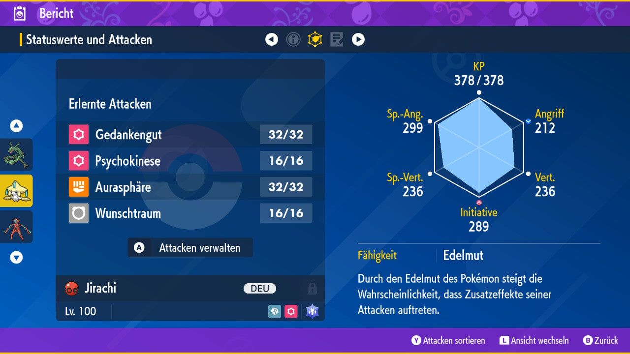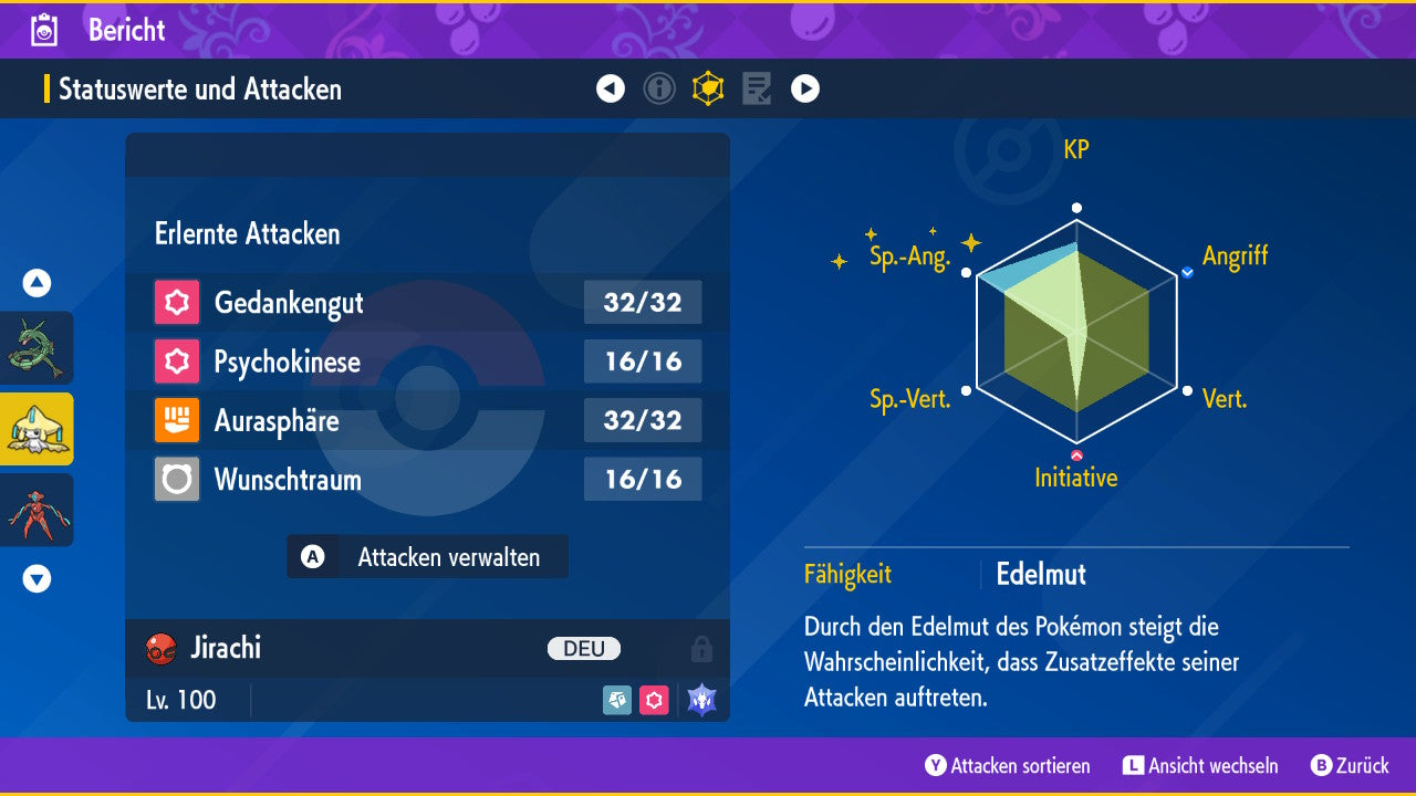 The Pokemon is equipped with impressive 6x31 IV values. This means that it has the maximum 31 IV/DV points for all six values (HP, Atk, Sp-Atk, Def, Sp-Def, Init). Your Pokemon therefore starts digital battles with outstanding strength.