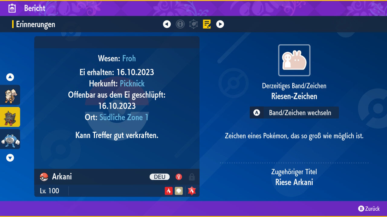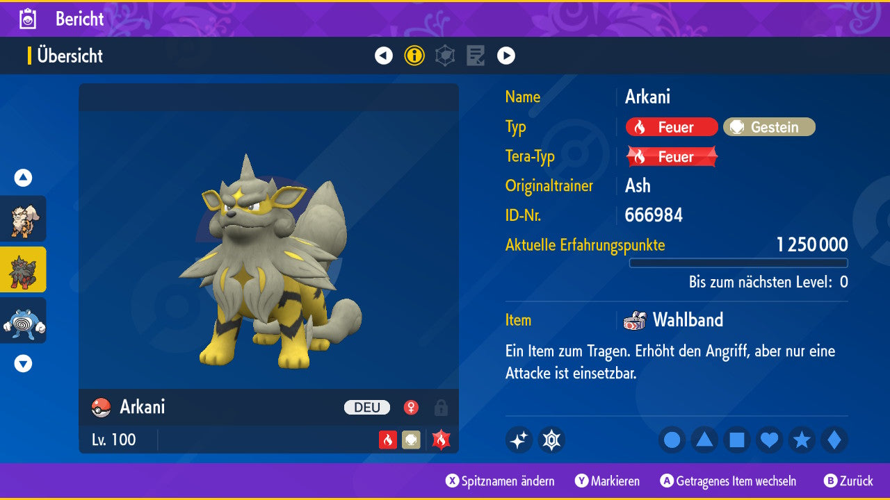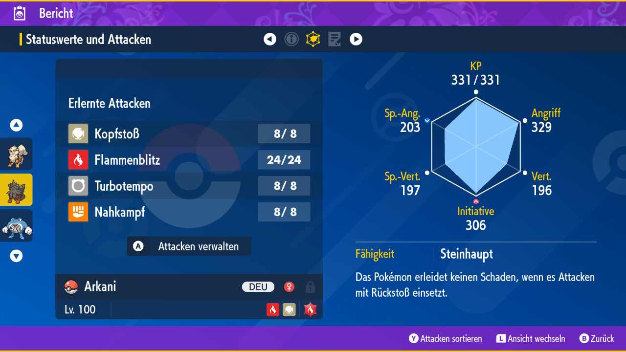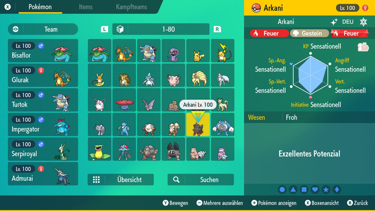 The Pokemon is equipped with impressive 6x31 IV values. This means that it has the maximum 31 IV/DV points for all six values (HP, Atk, Sp-Atk, Def, Sp-Def, Init). Your Pokemon therefore starts digital battles with outstanding strength.