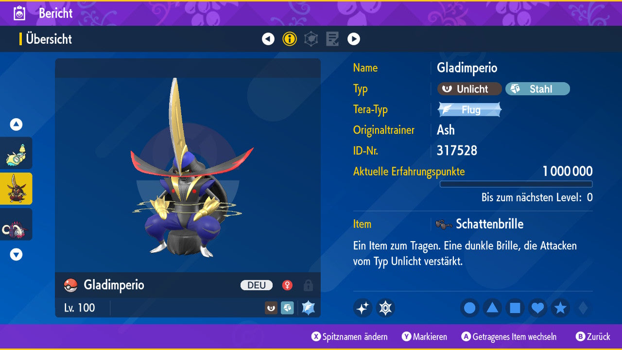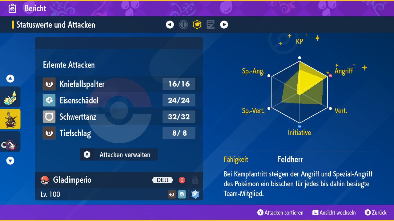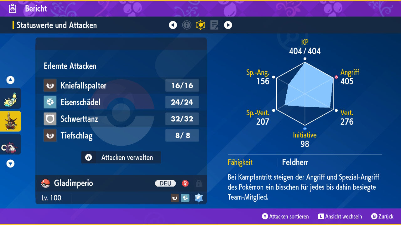 The Pokemon is equipped with impressive 6x31 IV values. This means that it has the maximum 31 IV/DV points for all six values (HP, Atk, Sp-Atk, Def, Sp-Def, Init). Your Pokemon therefore starts digital battles with outstanding strength.