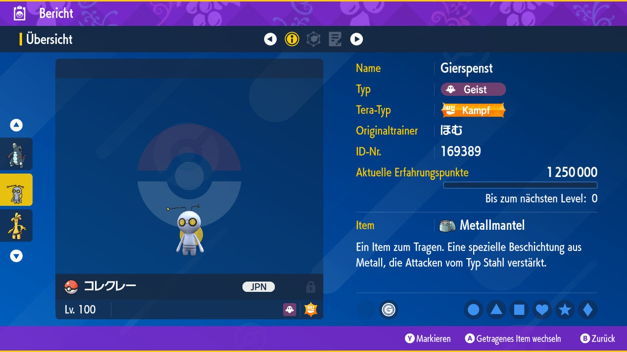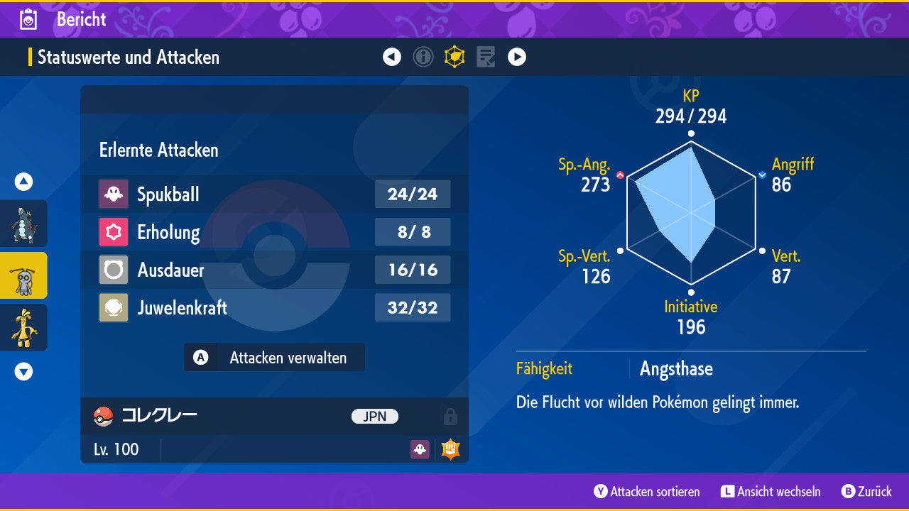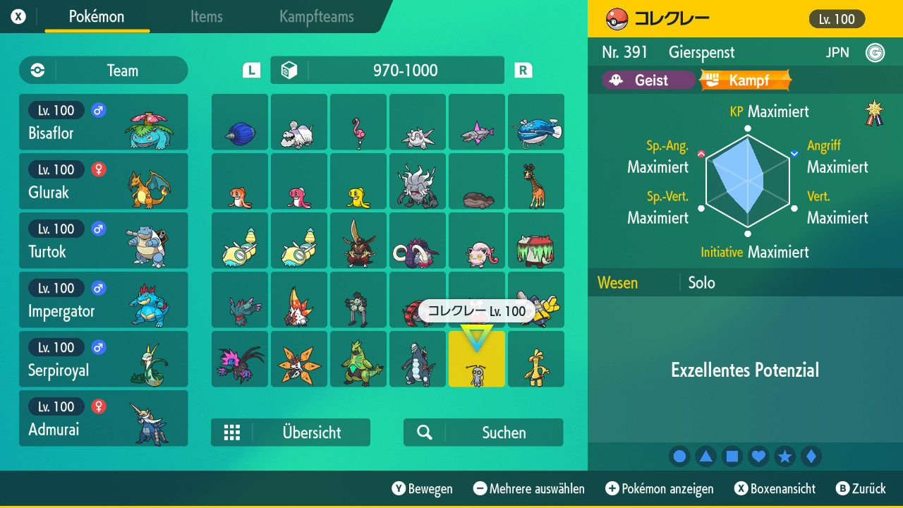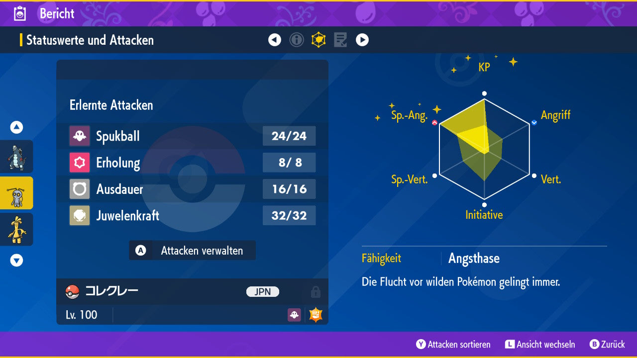 The Pokemon is equipped with impressive 6x31 IV values. This means that it has the maximum 31 IV/DV points for all six values (HP, Atk, Sp-Atk, Def, Sp-Def, Init). Your Pokemon therefore starts digital battles with outstanding strength.