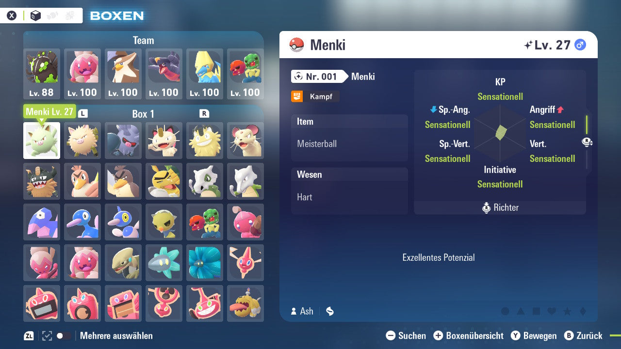 Das Pokemon ist mit beeindruckenden 6×31 IV-Werten ausgestattet. Das bedeutet, dass es auf allen sechs Werten (KP, Ang., Sp-Ang., Vert., Sp-Vert., Init.) die maximalen 31 IV/DV-Punkte besitzt. Dein Pokemon startet somit mit herausragender Stärke in digitale Kämpfe.