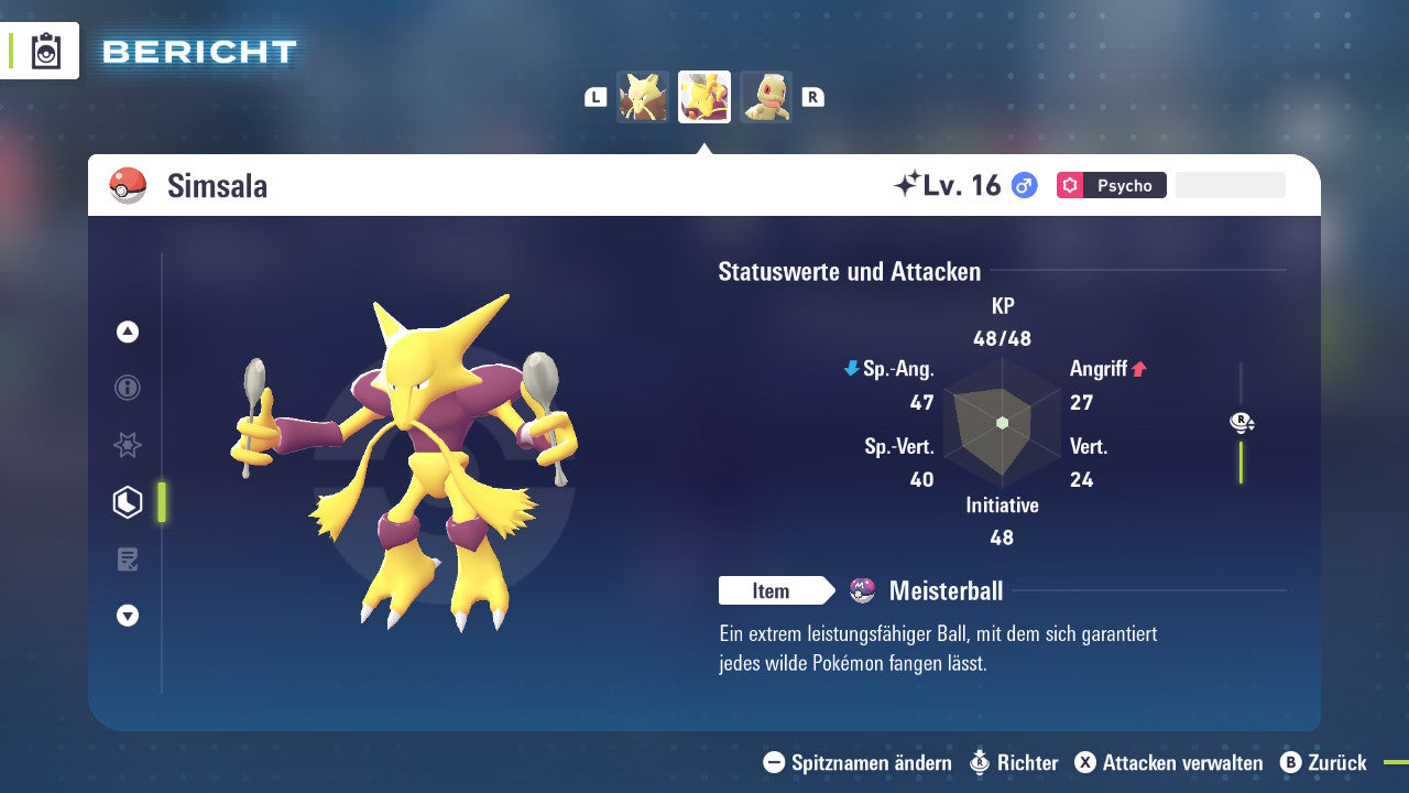 Das Pokemon ist mit beeindruckenden 6×31 IV-Werten ausgestattet. Das bedeutet, dass es auf allen sechs Werten (KP, Ang., Sp-Ang., Vert., Sp-Vert., Init.) die maximalen 31 IV/DV-Punkte besitzt. Dein Pokemon startet somit mit herausragender Stärke in digitale Kämpfe.