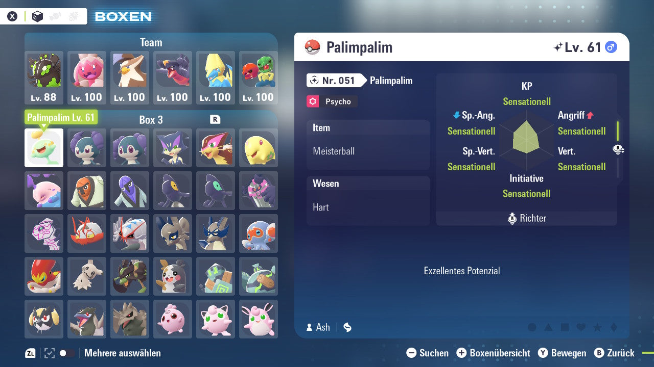 Das Pokemon ist mit beeindruckenden 6×31 IV-Werten ausgestattet. Das bedeutet, dass es auf allen sechs Werten (KP, Ang., Sp-Ang., Vert., Sp-Vert., Init.) die maximalen 31 IV/DV-Punkte besitzt. Dein Pokemon startet somit mit herausragender Stärke in digitale Kämpfe.