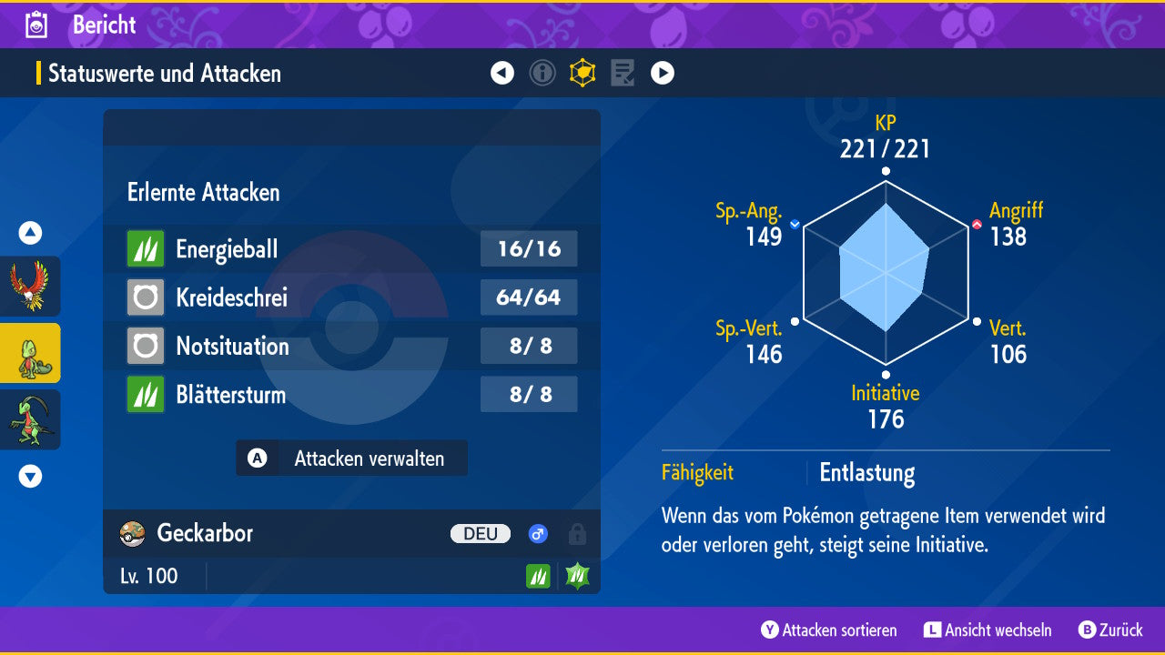 Le Pokémon est livré avec des statistiques impressionnantes de 6 × 31 IV. Cela signifie qu'il a le maximum de 31 points IV/DV sur les six statistiques (HP, Atk., Sp-Att., Vert., Sp-Vert., Init.). Votre Pokémon lancera des batailles numériques avec une force exceptionnelle.