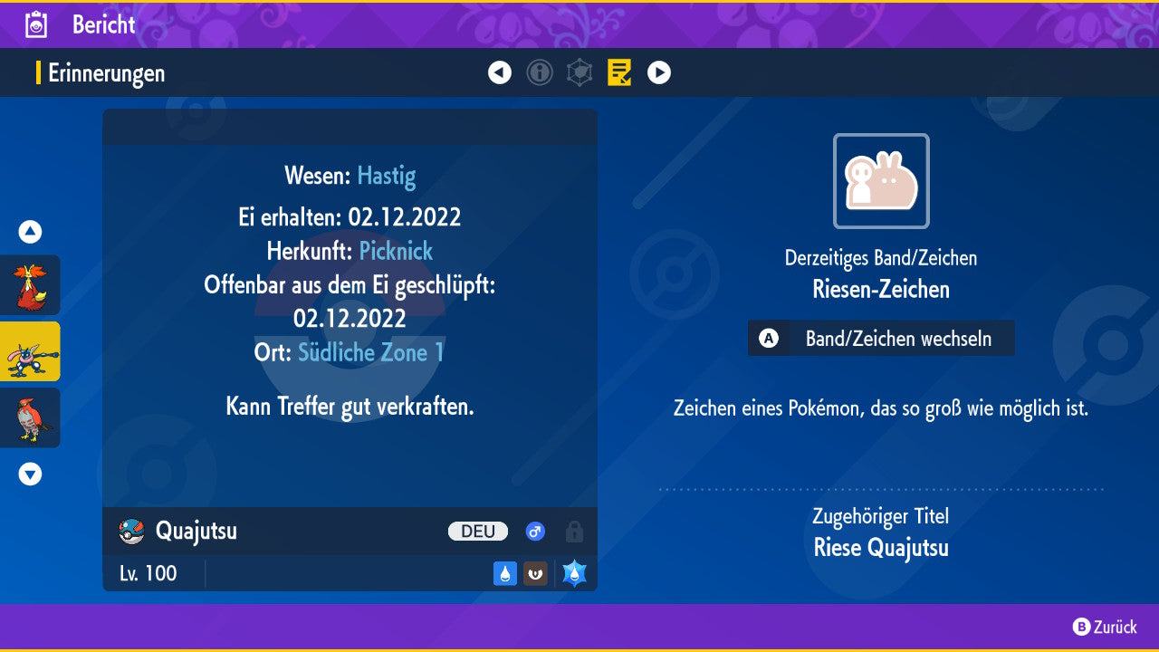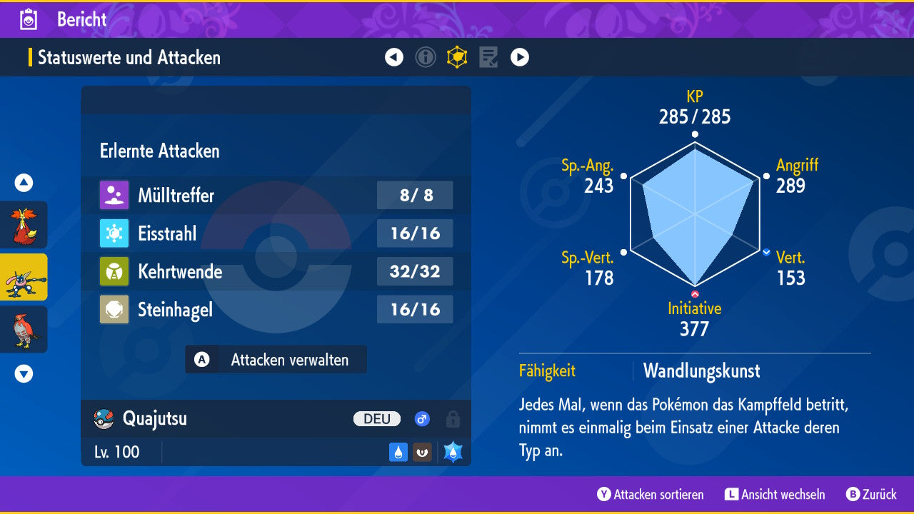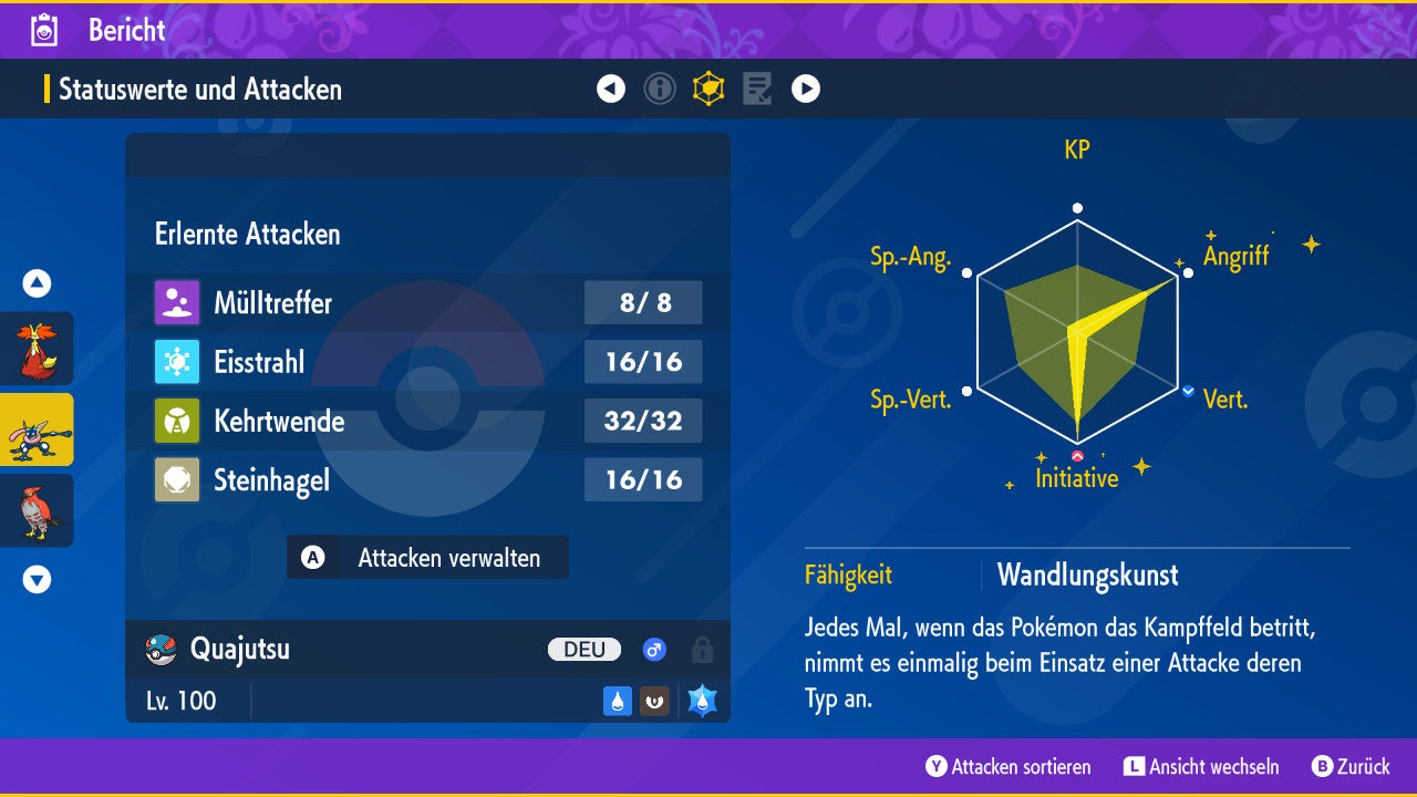 Le Pokémon est livré avec des statistiques impressionnantes de 6 × 31 IV. Cela signifie qu'il a le maximum de 31 points IV/DV sur les six statistiques (HP, Atk., Sp-Att., Vert., Sp-Vert., Init.). Votre Pokémon lancera des batailles numériques avec une force exceptionnelle.
