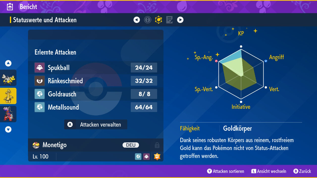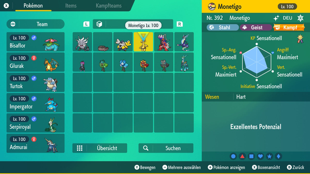 Le Pokémon est livré avec des statistiques impressionnantes de 6 × 31 IV. Cela signifie qu'il a le maximum de 31 points IV/DV sur les six statistiques (HP, Atk., Sp-Att., Vert., Sp-Vert., Init.). Votre Pokémon lancera des batailles numériques avec une force exceptionnelle.