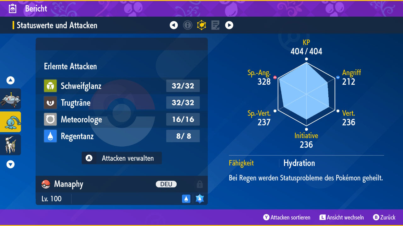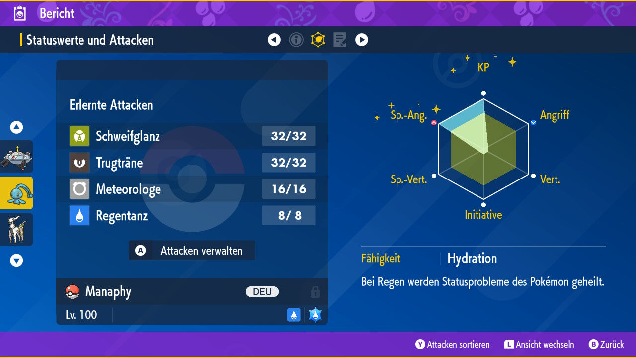 Le Pokémon est livré avec des statistiques impressionnantes de 6 × 31 IV. Cela signifie qu'il a le maximum de 31 points IV/DV sur les six statistiques (HP, Atk., Sp-Att., Vert., Sp-Vert., Init.). Votre Pokémon lancera des batailles numériques avec une force exceptionnelle.