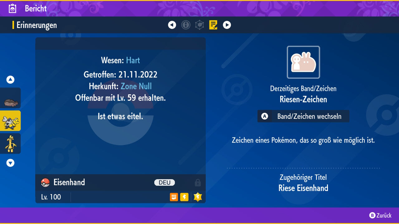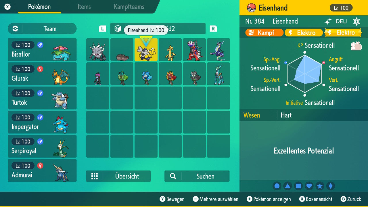 Le Pokémon est livré avec des statistiques impressionnantes de 6 × 31 IV. Cela signifie qu'il a le maximum de 31 points IV/DV sur les six statistiques (HP, Atk., Sp-Att., Vert., Sp-Vert., Init.). Votre Pokémon lancera des batailles numériques avec une force exceptionnelle.