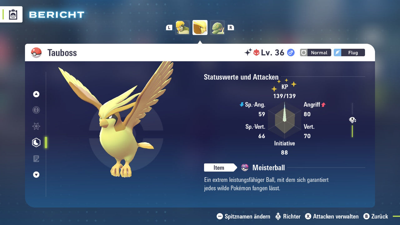 Das Pokemon ist mit beeindruckenden 6×31 IV-Werten ausgestattet. Das bedeutet, dass es auf allen sechs Werten (KP, Ang., Sp-Ang., Vert., Sp-Vert., Init.) die maximalen 31 IV/DV-Punkte besitzt. Dein Pokemon startet somit mit herausragender Stärke in digitale Kämpfe.