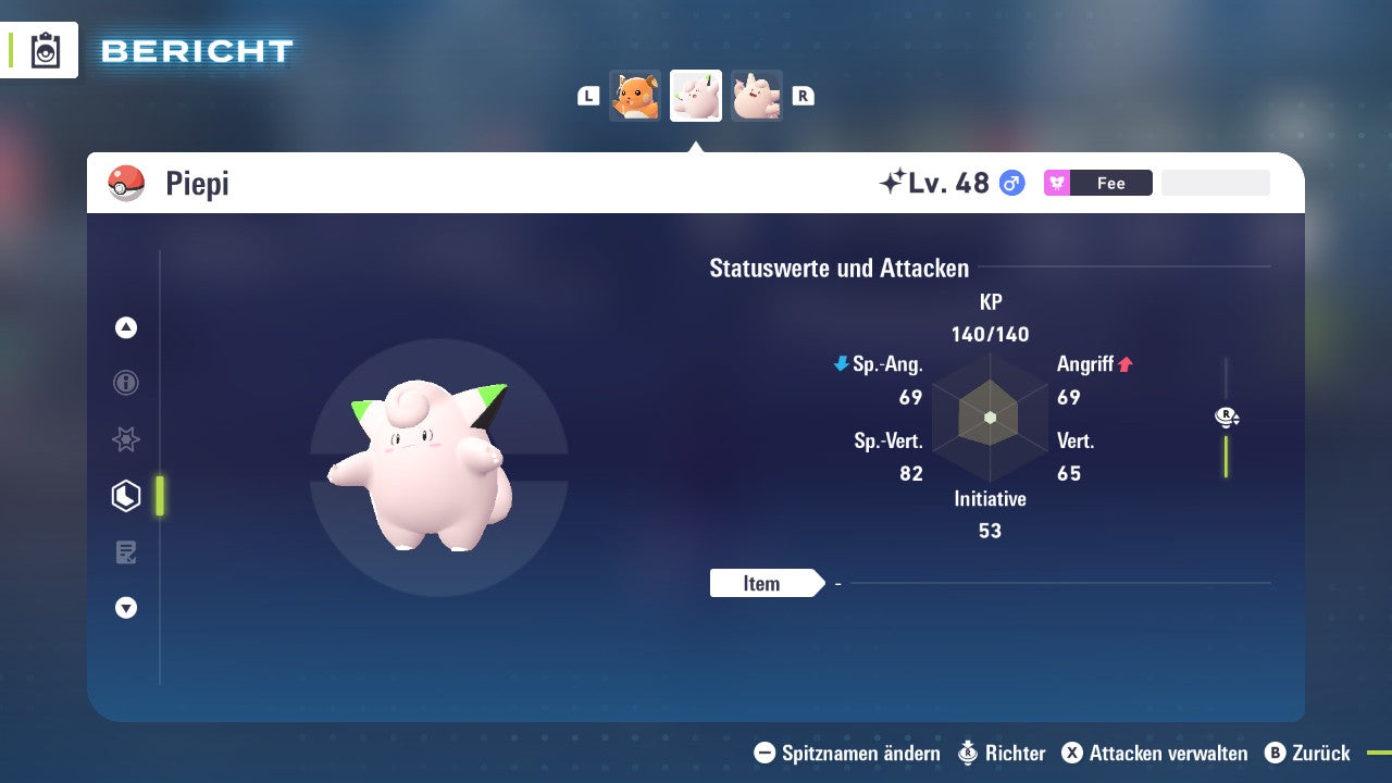 Das Pokemon ist mit beeindruckenden 6×31 IV-Werten ausgestattet. Das bedeutet, dass es auf allen sechs Werten (KP, Ang., Sp-Ang., Vert., Sp-Vert., Init.) die maximalen 31 IV/DV-Punkte besitzt. Dein Pokemon startet somit mit herausragender Stärke in digitale Kämpfe.