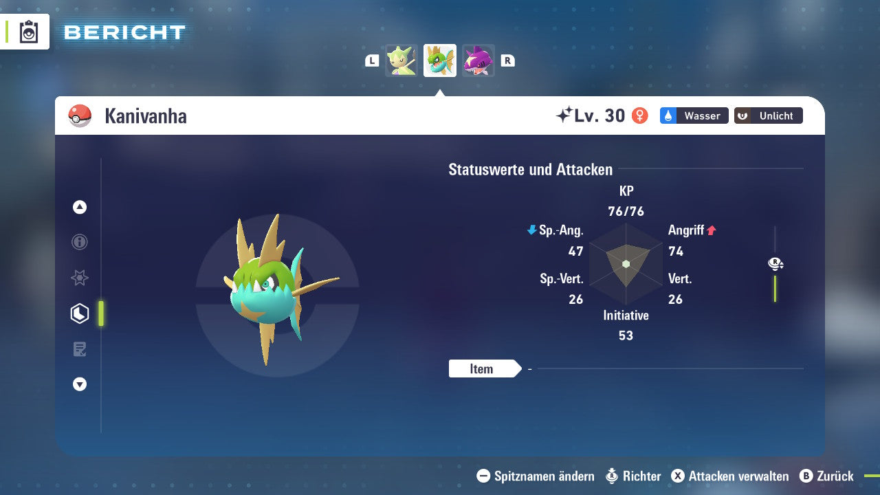 Das Pokemon ist mit beeindruckenden 6×31 IV-Werten ausgestattet. Das bedeutet, dass es auf allen sechs Werten (KP, Ang., Sp-Ang., Vert., Sp-Vert., Init.) die maximalen 31 IV/DV-Punkte besitzt. Dein Pokemon startet somit mit herausragender Stärke in digitale Kämpfe.