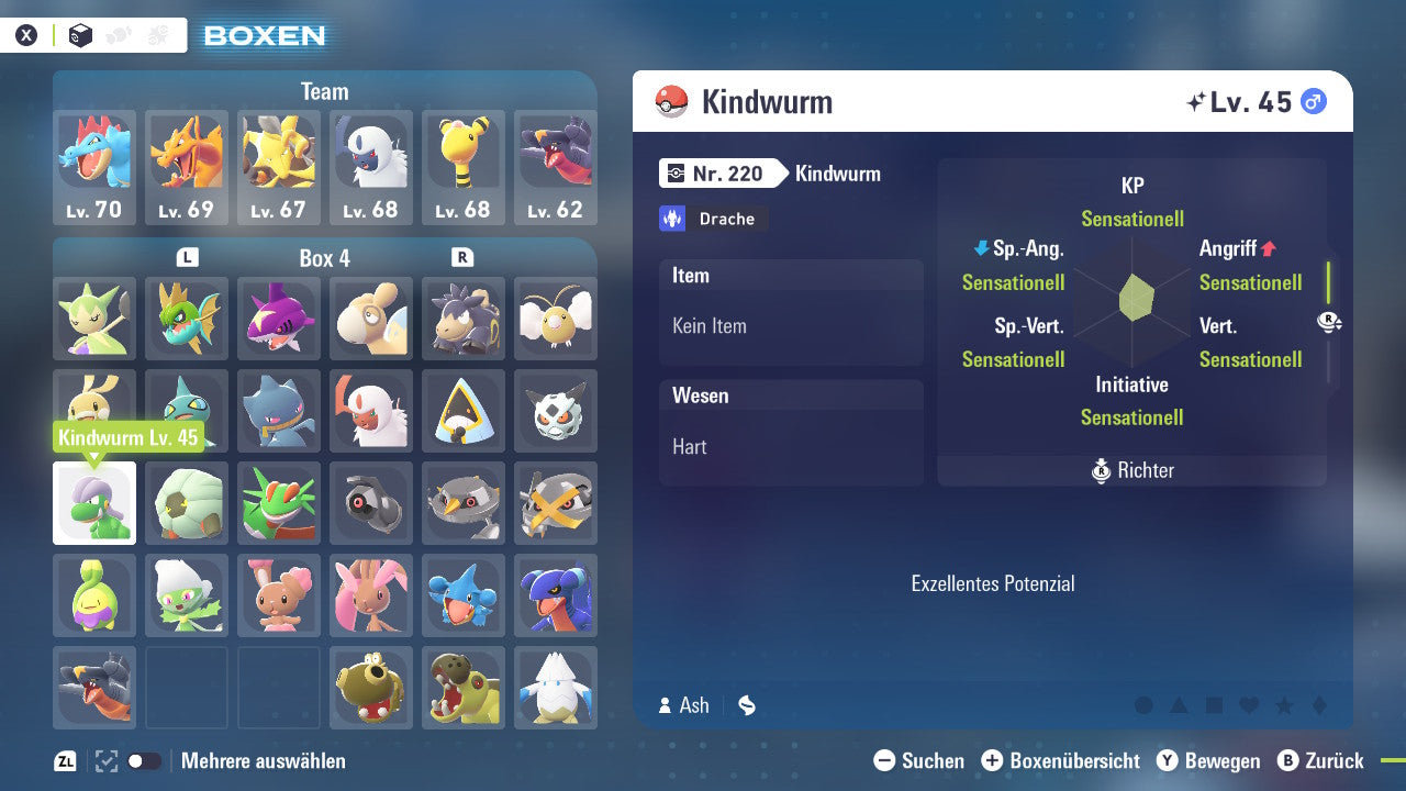 Das Pokemon ist mit beeindruckenden 6×31 IV-Werten ausgestattet. Das bedeutet, dass es auf allen sechs Werten (KP, Ang., Sp-Ang., Vert., Sp-Vert., Init.) die maximalen 31 IV/DV-Punkte besitzt. Dein Pokemon startet somit mit herausragender Stärke in digitale Kämpfe.