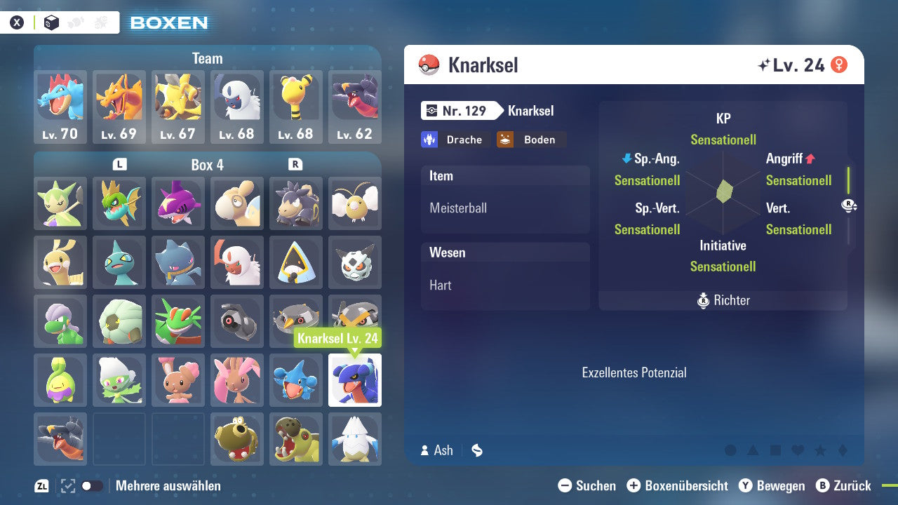 Das Pokemon ist mit beeindruckenden 6×31 IV-Werten ausgestattet. Das bedeutet, dass es auf allen sechs Werten (KP, Ang., Sp-Ang., Vert., Sp-Vert., Init.) die maximalen 31 IV/DV-Punkte besitzt. Dein Pokemon startet somit mit herausragender Stärke in digitale Kämpfe.