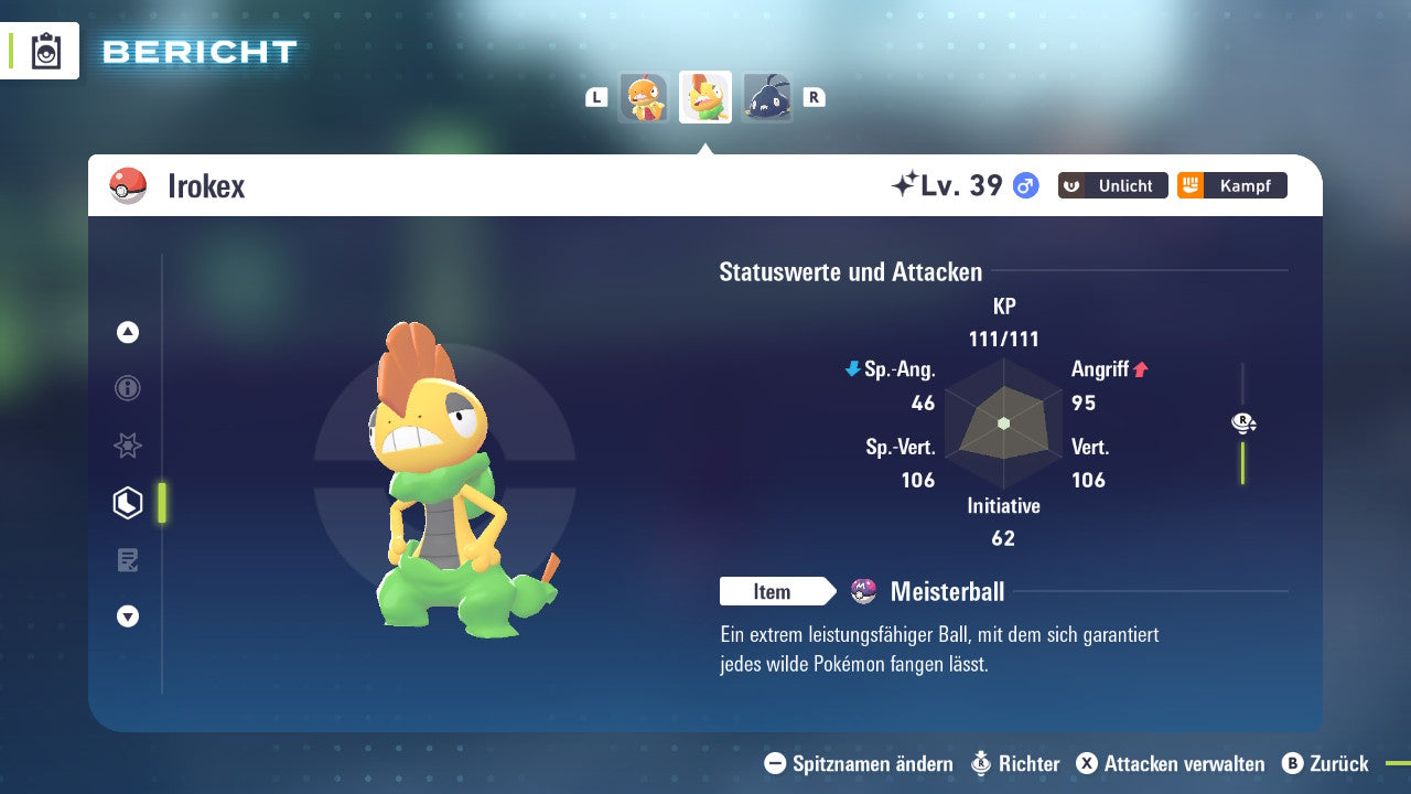 Das Pokemon ist mit beeindruckenden 6×31 IV-Werten ausgestattet. Das bedeutet, dass es auf allen sechs Werten (KP, Ang., Sp-Ang., Vert., Sp-Vert., Init.) die maximalen 31 IV/DV-Punkte besitzt. Dein Pokemon startet somit mit herausragender Stärke in digitale Kämpfe.