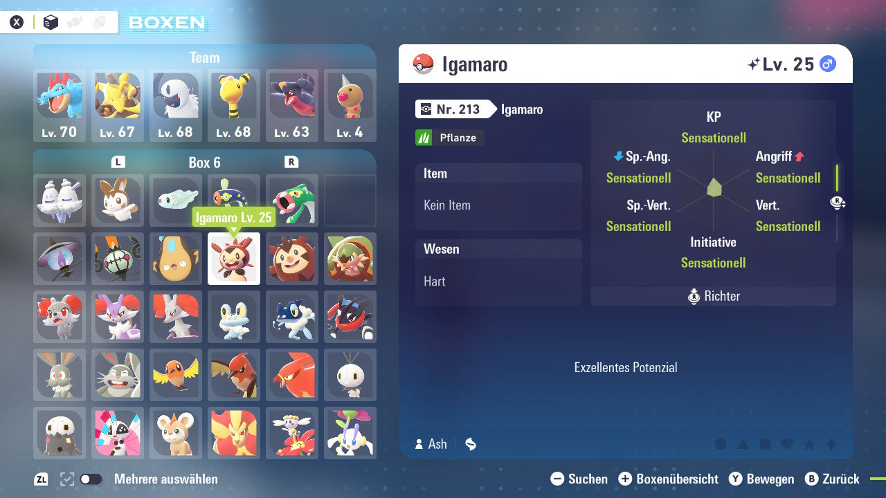 Das Pokemon ist mit beeindruckenden 6×31 IV-Werten ausgestattet. Das bedeutet, dass es auf allen sechs Werten (KP, Ang., Sp-Ang., Vert., Sp-Vert., Init.) die maximalen 31 IV/DV-Punkte besitzt. Dein Pokemon startet somit mit herausragender Stärke in digitale Kämpfe.