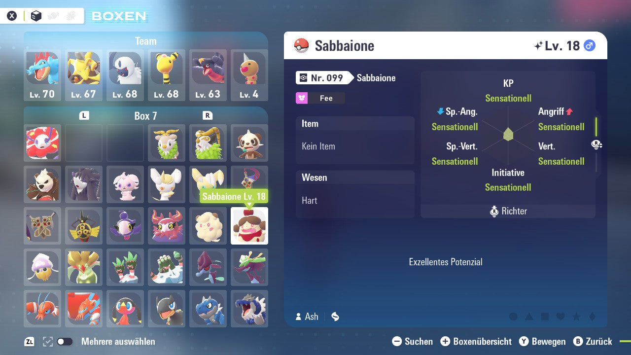 Das Pokemon ist mit beeindruckenden 6×31 IV-Werten ausgestattet. Das bedeutet, dass es auf allen sechs Werten (KP, Ang., Sp-Ang., Vert., Sp-Vert., Init.) die maximalen 31 IV/DV-Punkte besitzt. Dein Pokemon startet somit mit herausragender Stärke in digitale Kämpfe.