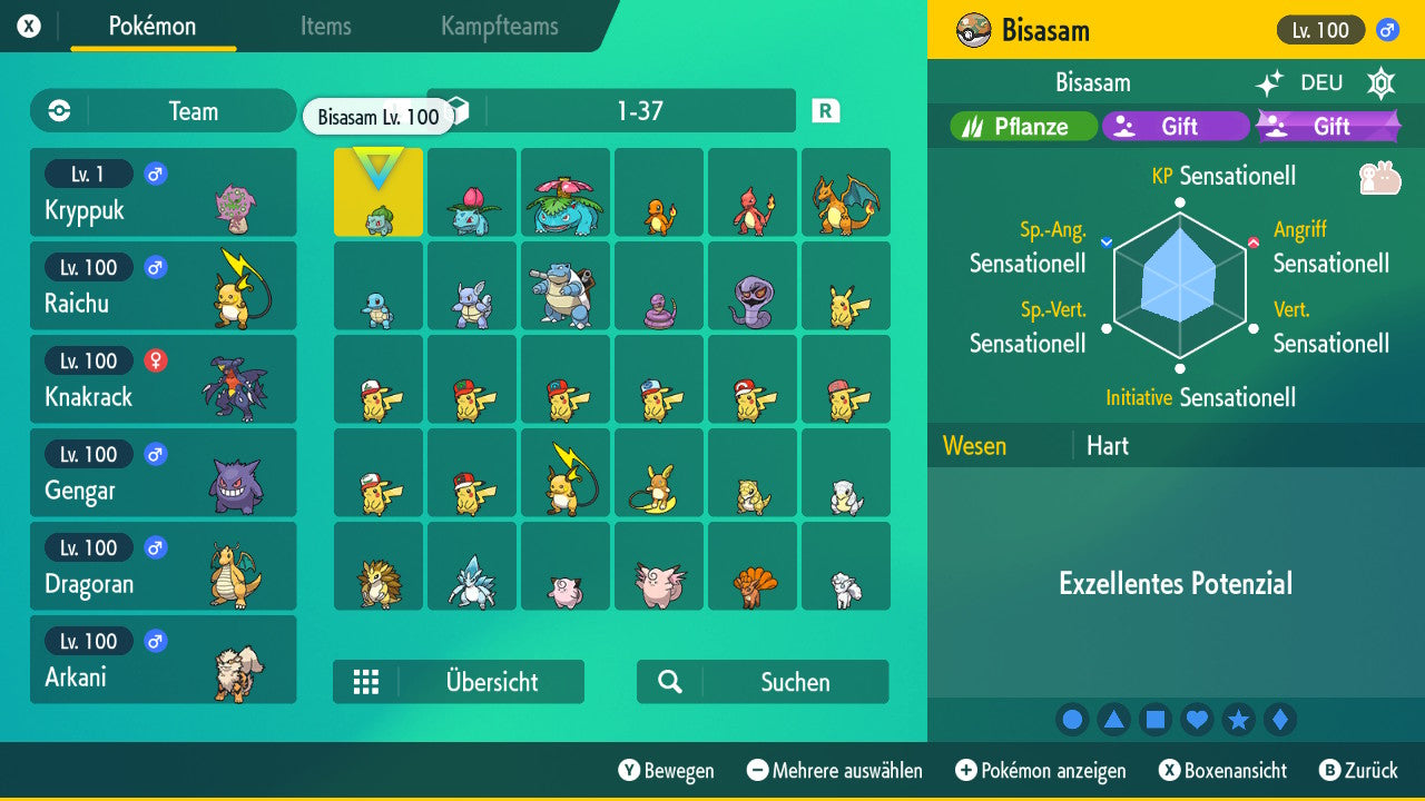 Das Pokemon ist mit beeindruckenden 6×31 IV-Werten ausgestattet. Das bedeutet, dass es auf allen sechs Werten (KP, Ang., Sp-Ang., Vert., Sp-Vert., Init.) die maximalen 31 IV/DV-Punkte besitzt. Dein Pokemon startet somit mit herausragender Stärke in digitale Kämpfe.