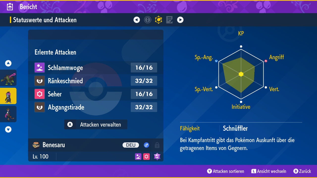 Das Pokemon ist mit beeindruckenden 6×31 IV-Werten ausgestattet. Das bedeutet, dass es auf allen sechs Werten (KP, Ang., Sp-Ang., Vert., Sp-Vert., Init.) die maximalen 31 IV/DV-Punkte besitzt. Dein Pokemon startet somit mit herausragender Stärke in digitale Kämpfe.