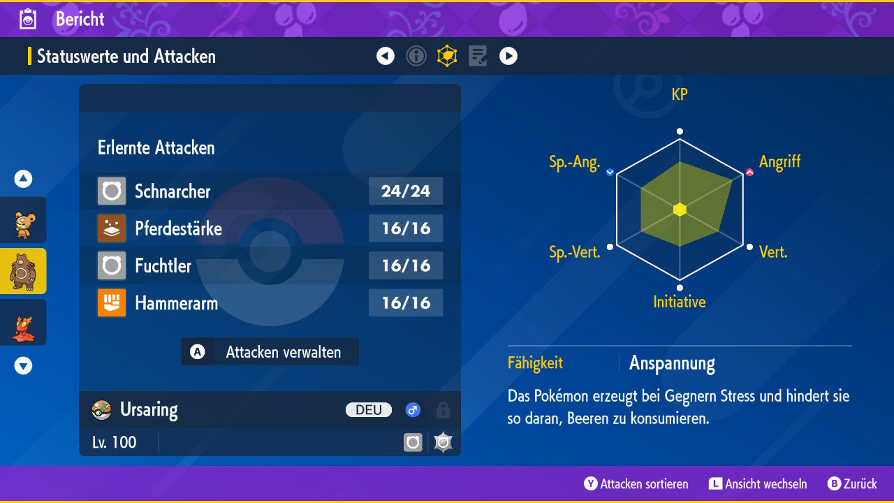 Das Pokemon ist mit beeindruckenden 6×31 IV-Werten ausgestattet. Das bedeutet, dass es auf allen sechs Werten (KP, Ang., Sp-Ang., Vert., Sp-Vert., Init.) die maximalen 31 IV/DV-Punkte besitzt. Dein Pokemon startet somit mit herausragender Stärke in digitale Kämpfe.