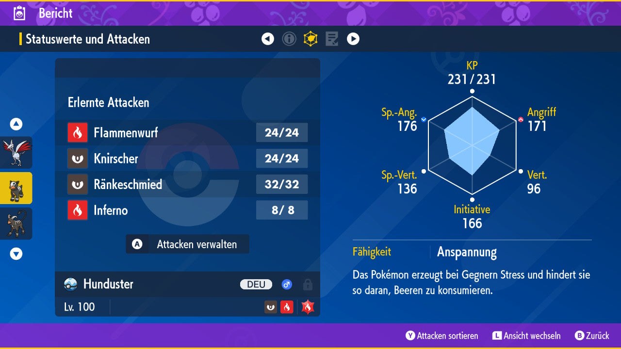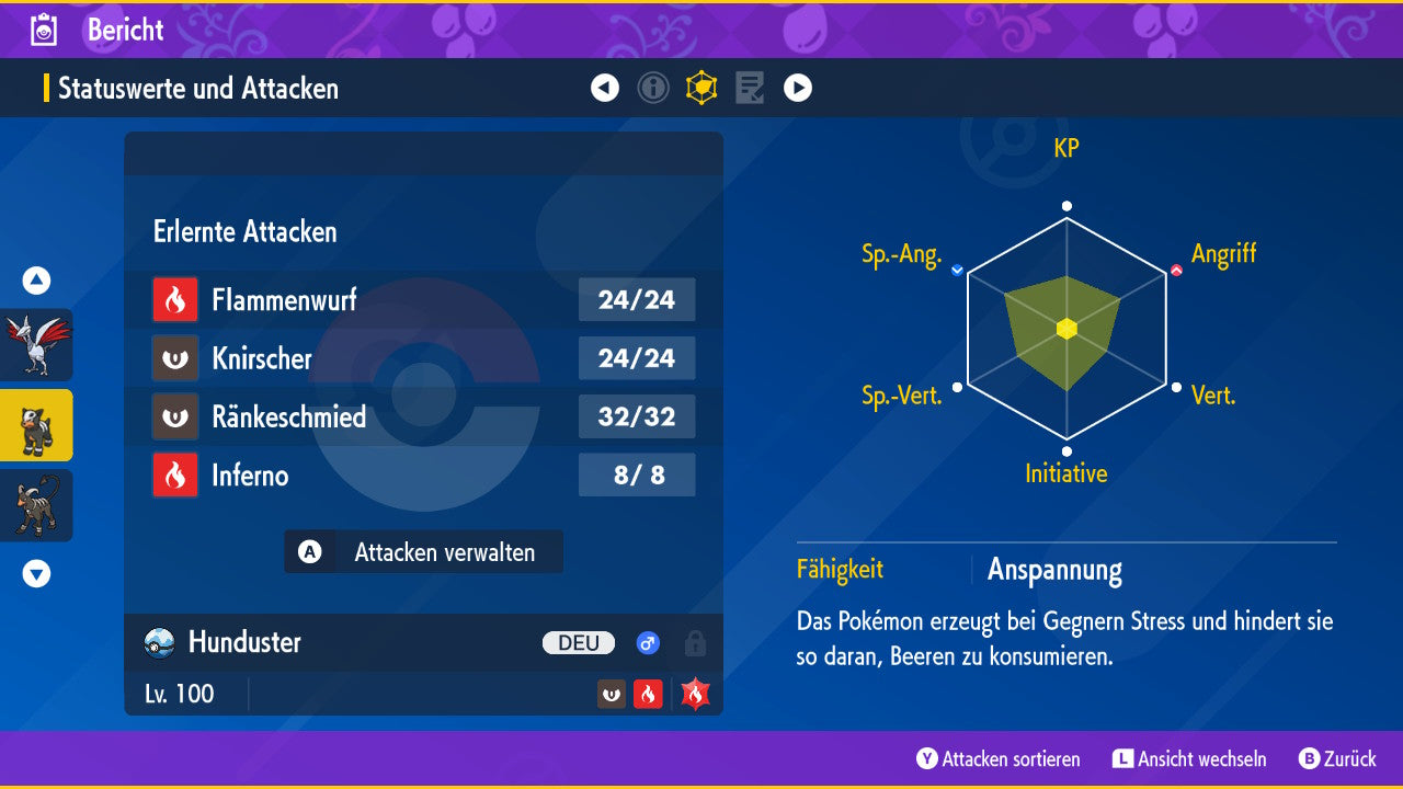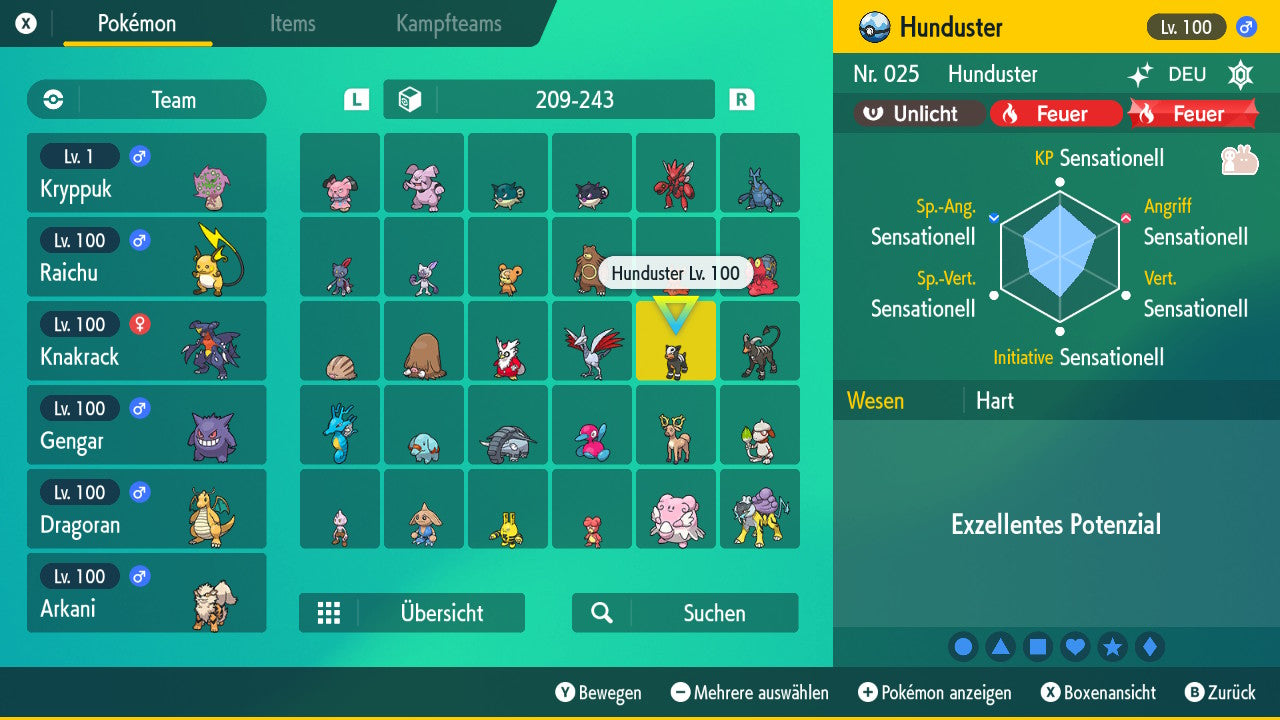 Das Pokemon ist mit beeindruckenden 6×31 IV-Werten ausgestattet. Das bedeutet, dass es auf allen sechs Werten (KP, Ang., Sp-Ang., Vert., Sp-Vert., Init.) die maximalen 31 IV/DV-Punkte besitzt. Dein Pokemon startet somit mit herausragender Stärke in digitale Kämpfe.