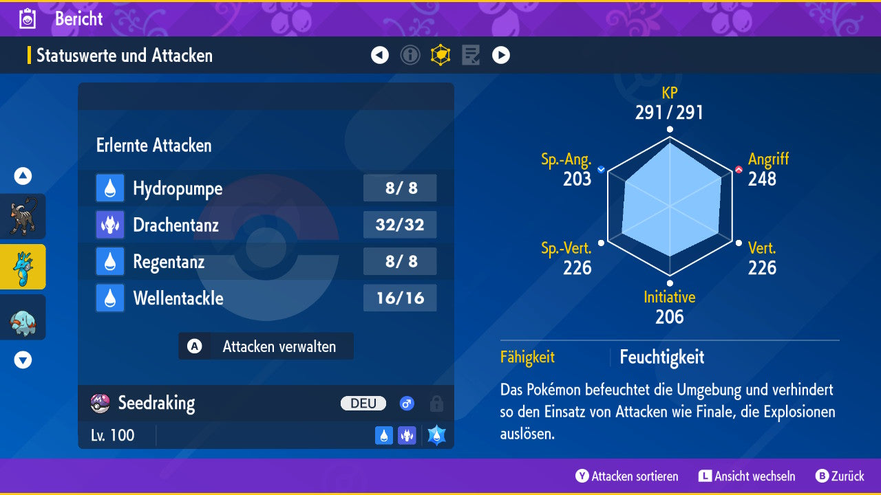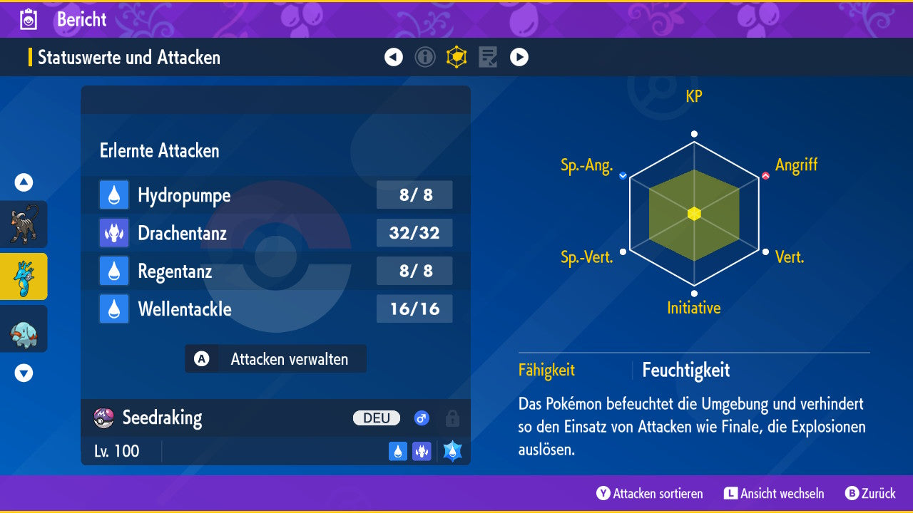 Das Pokemon ist mit beeindruckenden 6×31 IV-Werten ausgestattet. Das bedeutet, dass es auf allen sechs Werten (KP, Ang., Sp-Ang., Vert., Sp-Vert., Init.) die maximalen 31 IV/DV-Punkte besitzt. Dein Pokemon startet somit mit herausragender Stärke in digitale Kämpfe.