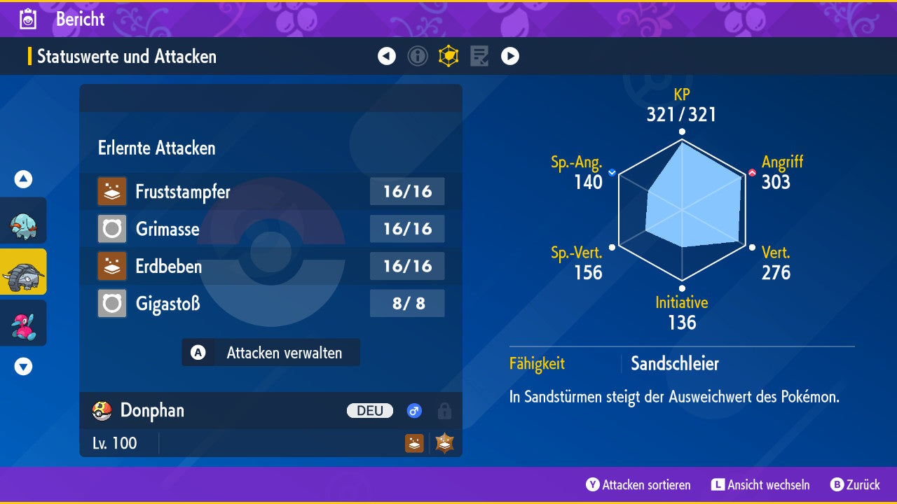 Das Pokemon ist mit beeindruckenden 6×31 IV-Werten ausgestattet. Das bedeutet, dass es auf allen sechs Werten (KP, Ang., Sp-Ang., Vert., Sp-Vert., Init.) die maximalen 31 IV/DV-Punkte besitzt. Dein Pokemon startet somit mit herausragender Stärke in digitale Kämpfe.