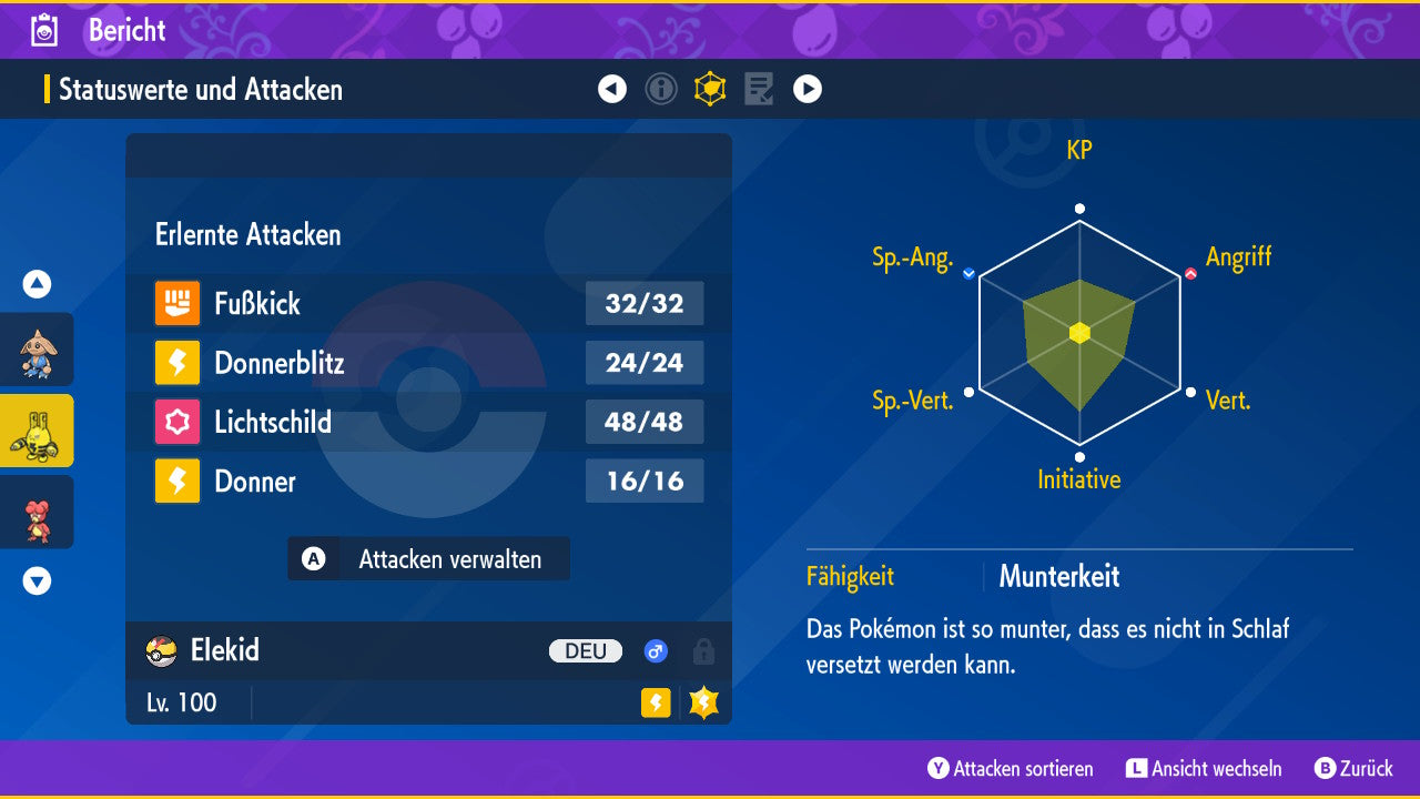 Das Pokemon ist mit beeindruckenden 6×31 IV-Werten ausgestattet. Das bedeutet, dass es auf allen sechs Werten (KP, Ang., Sp-Ang., Vert., Sp-Vert., Init.) die maximalen 31 IV/DV-Punkte besitzt. Dein Pokemon startet somit mit herausragender Stärke in digitale Kämpfe.