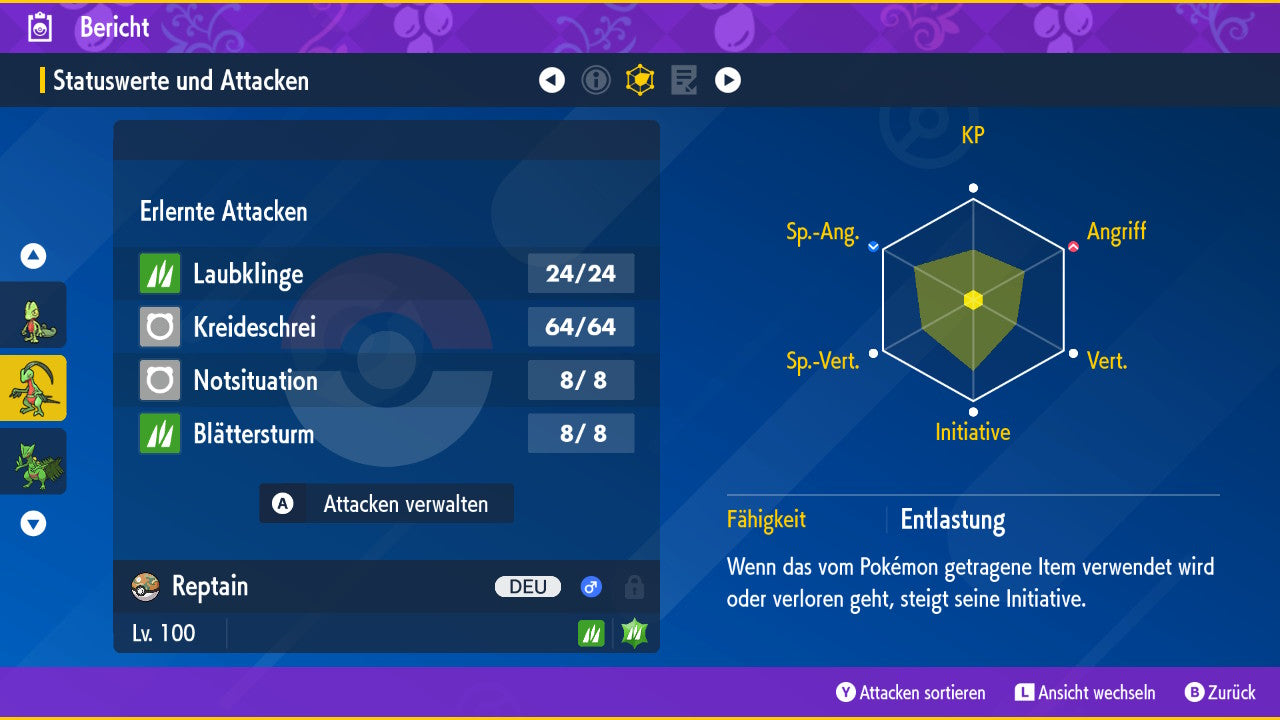 Das Pokemon ist mit beeindruckenden 6×31 IV-Werten ausgestattet. Das bedeutet, dass es auf allen sechs Werten (KP, Ang., Sp-Ang., Vert., Sp-Vert., Init.) die maximalen 31 IV/DV-Punkte besitzt. Dein Pokemon startet somit mit herausragender Stärke in digitale Kämpfe.