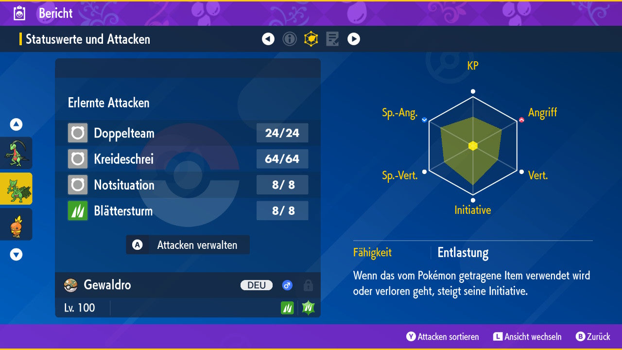 Das Pokemon ist mit beeindruckenden 6×31 IV-Werten ausgestattet. Das bedeutet, dass es auf allen sechs Werten (KP, Ang., Sp-Ang., Vert., Sp-Vert., Init.) die maximalen 31 IV/DV-Punkte besitzt. Dein Pokemon startet somit mit herausragender Stärke in digitale Kämpfe.
