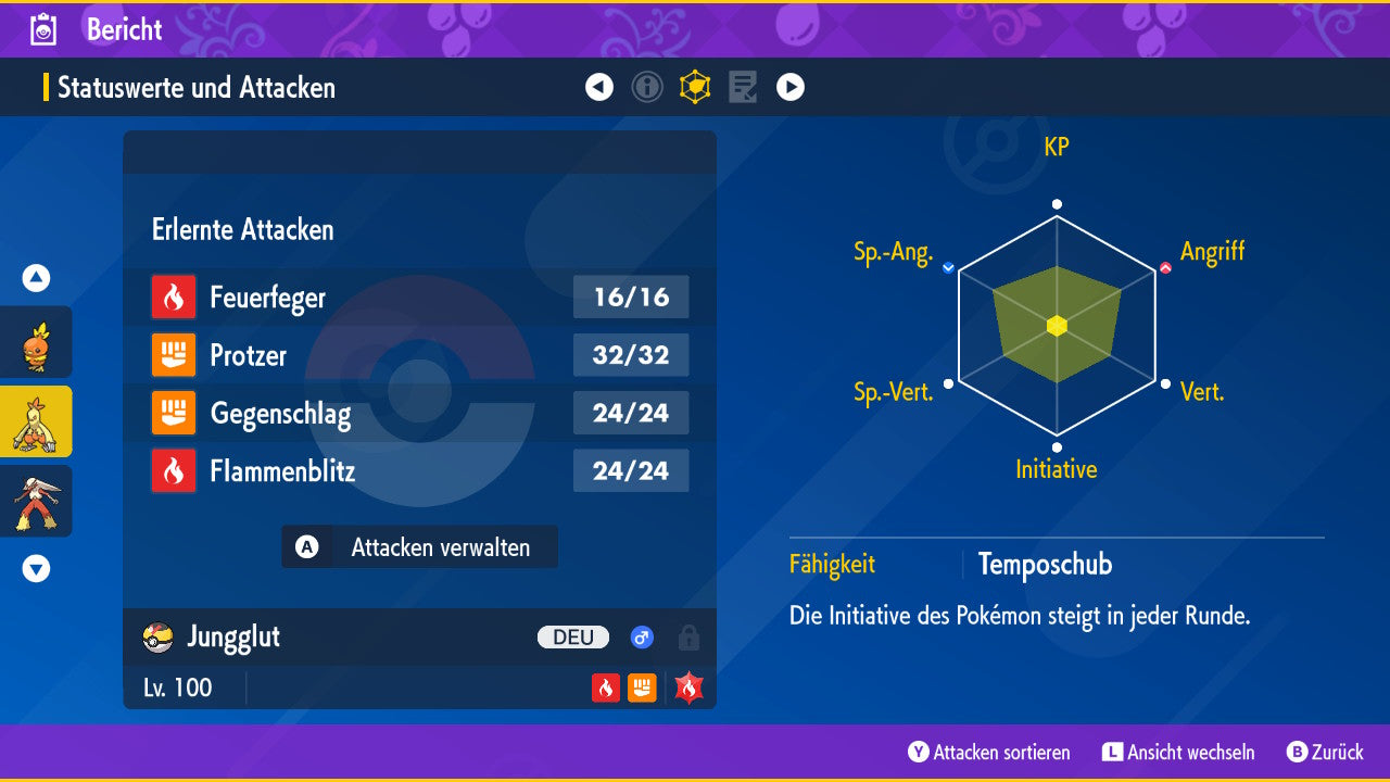 Das Pokemon ist mit beeindruckenden 6×31 IV-Werten ausgestattet. Das bedeutet, dass es auf allen sechs Werten (KP, Ang., Sp-Ang., Vert., Sp-Vert., Init.) die maximalen 31 IV/DV-Punkte besitzt. Dein Pokemon startet somit mit herausragender Stärke in digitale Kämpfe.