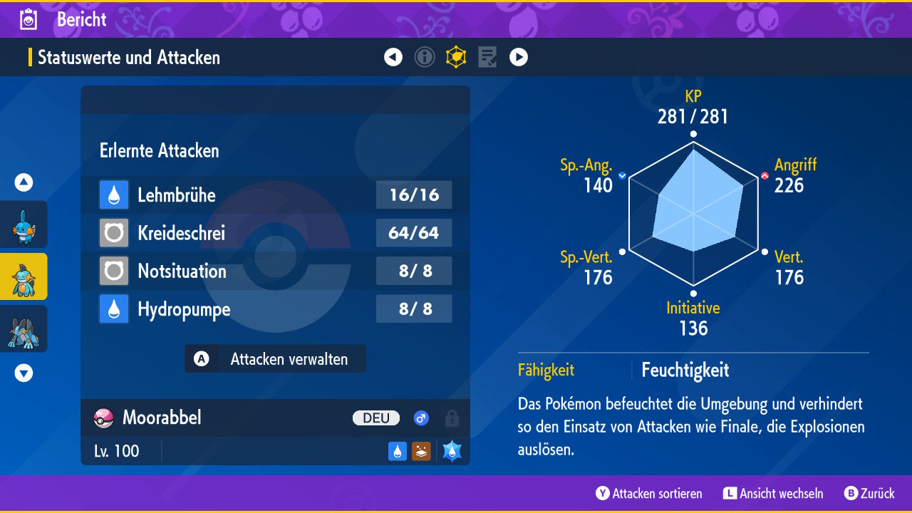 Das Pokemon ist mit beeindruckenden 6×31 IV-Werten ausgestattet. Das bedeutet, dass es auf allen sechs Werten (KP, Ang., Sp-Ang., Vert., Sp-Vert., Init.) die maximalen 31 IV/DV-Punkte besitzt. Dein Pokemon startet somit mit herausragender Stärke in digitale Kämpfe.