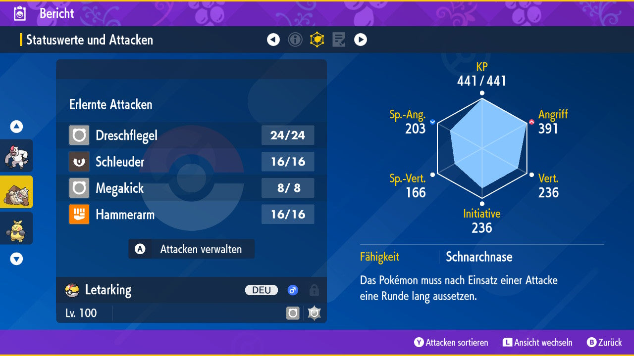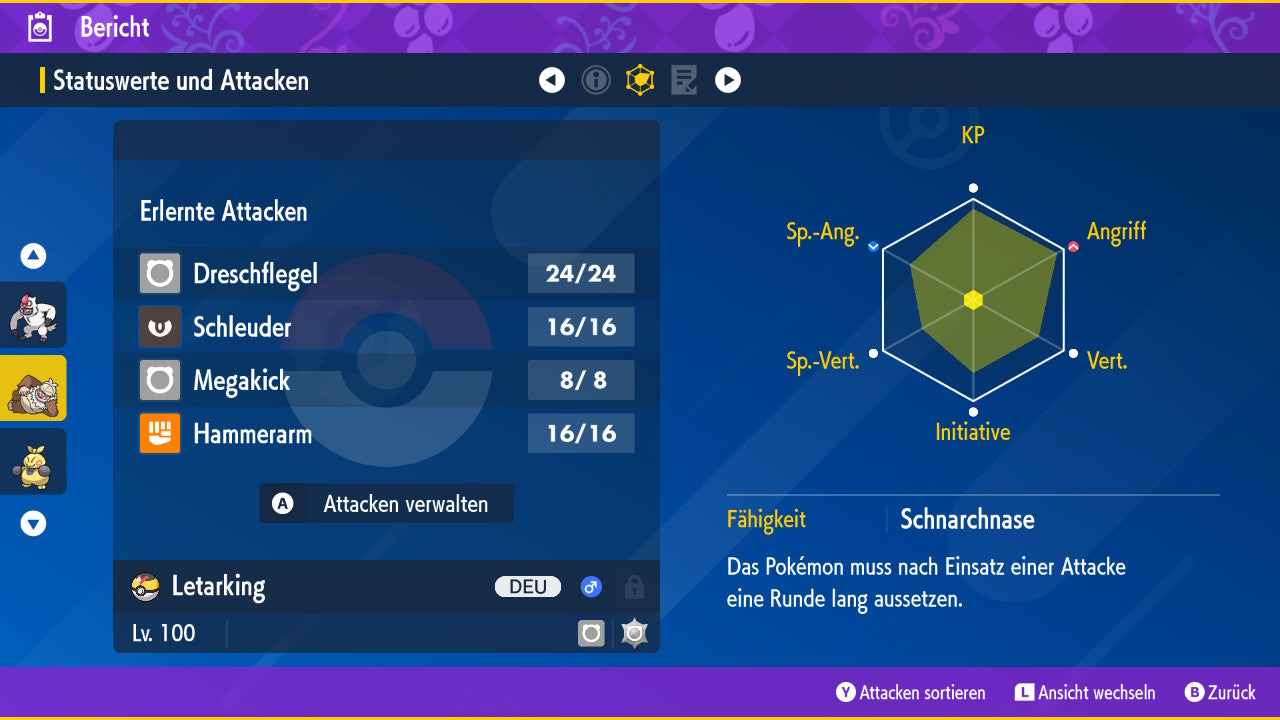 Das Pokemon ist mit beeindruckenden 6×31 IV-Werten ausgestattet. Das bedeutet, dass es auf allen sechs Werten (KP, Ang., Sp-Ang., Vert., Sp-Vert., Init.) die maximalen 31 IV/DV-Punkte besitzt. Dein Pokemon startet somit mit herausragender Stärke in digitale Kämpfe.
