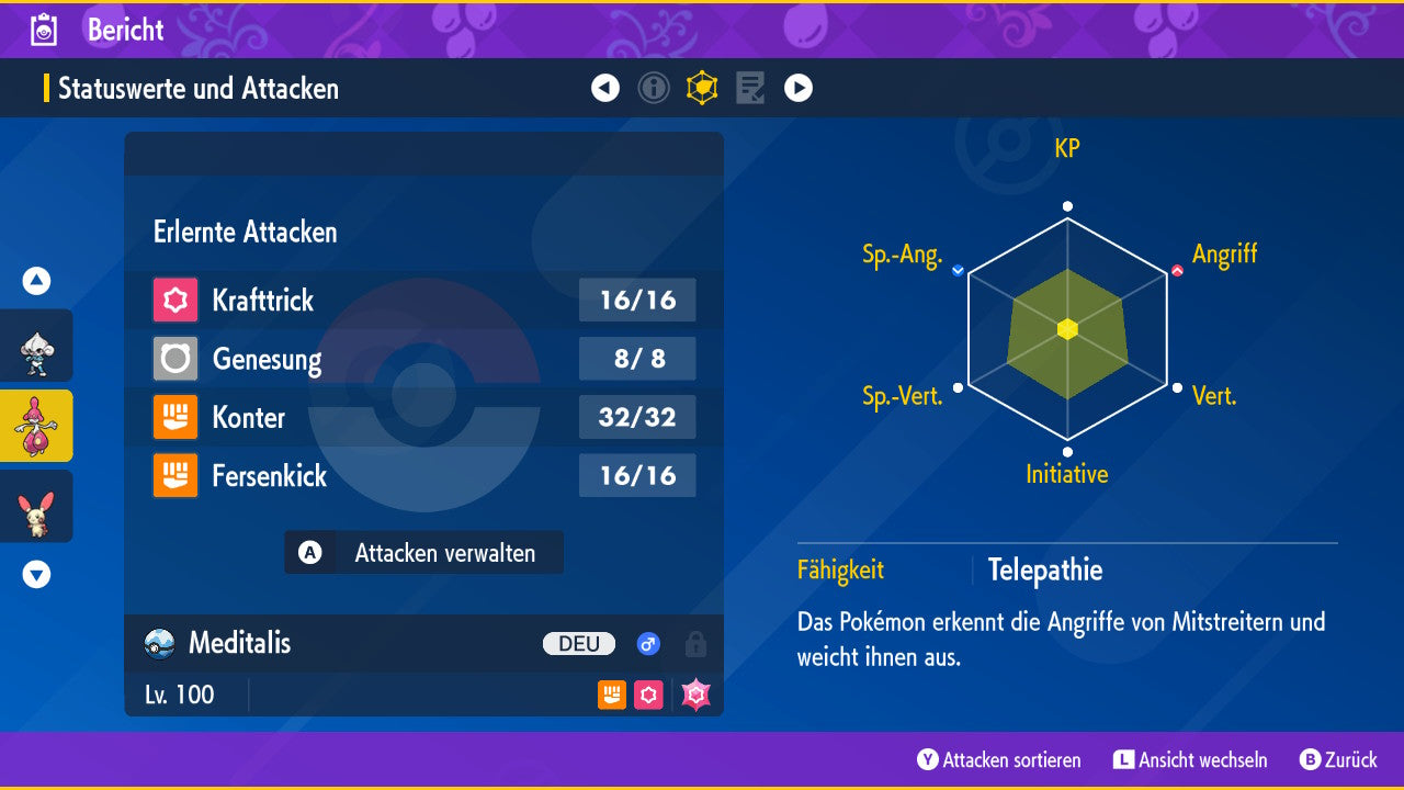 Das Pokemon ist mit beeindruckenden 6×31 IV-Werten ausgestattet. Das bedeutet, dass es auf allen sechs Werten (KP, Ang., Sp-Ang., Vert., Sp-Vert., Init.) die maximalen 31 IV/DV-Punkte besitzt. Dein Pokemon startet somit mit herausragender Stärke in digitale Kämpfe.