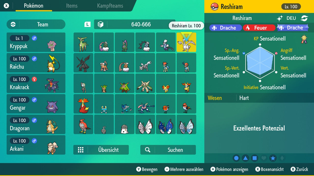 Das Pokemon ist mit beeindruckenden 6×31 IV-Werten ausgestattet. Das bedeutet, dass es auf allen sechs Werten (KP, Ang., Sp-Ang., Vert., Sp-Vert., Init.) die maximalen 31 IV/DV-Punkte besitzt. Dein Pokemon startet somit mit herausragender Stärke in digitale Kämpfe.