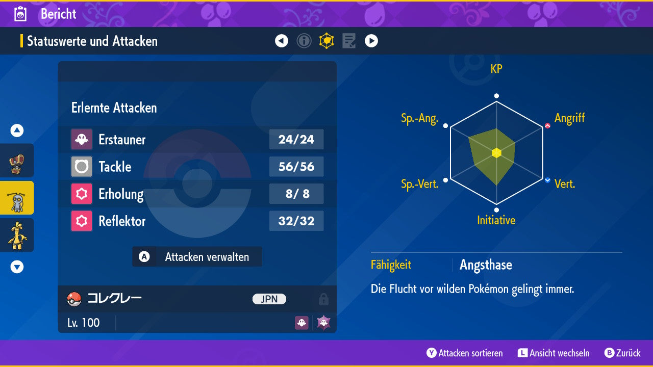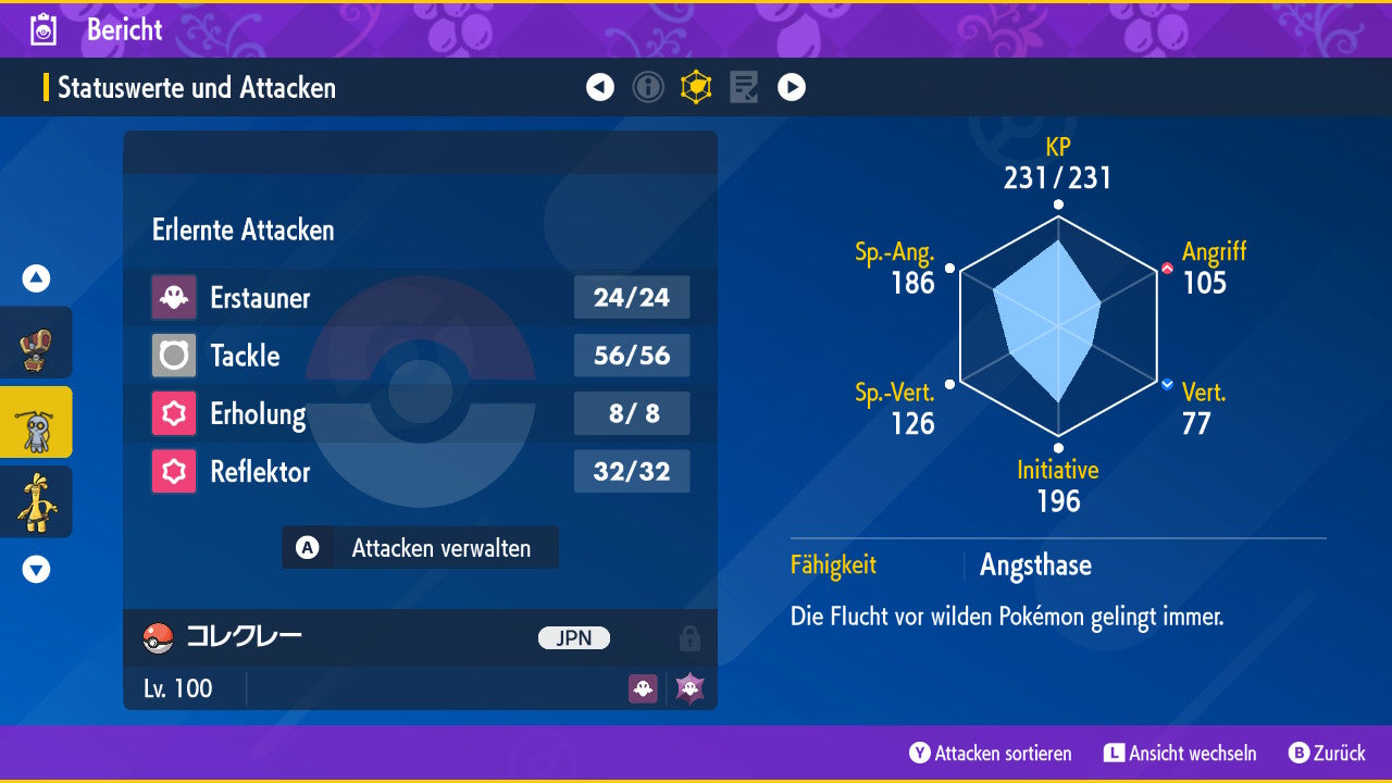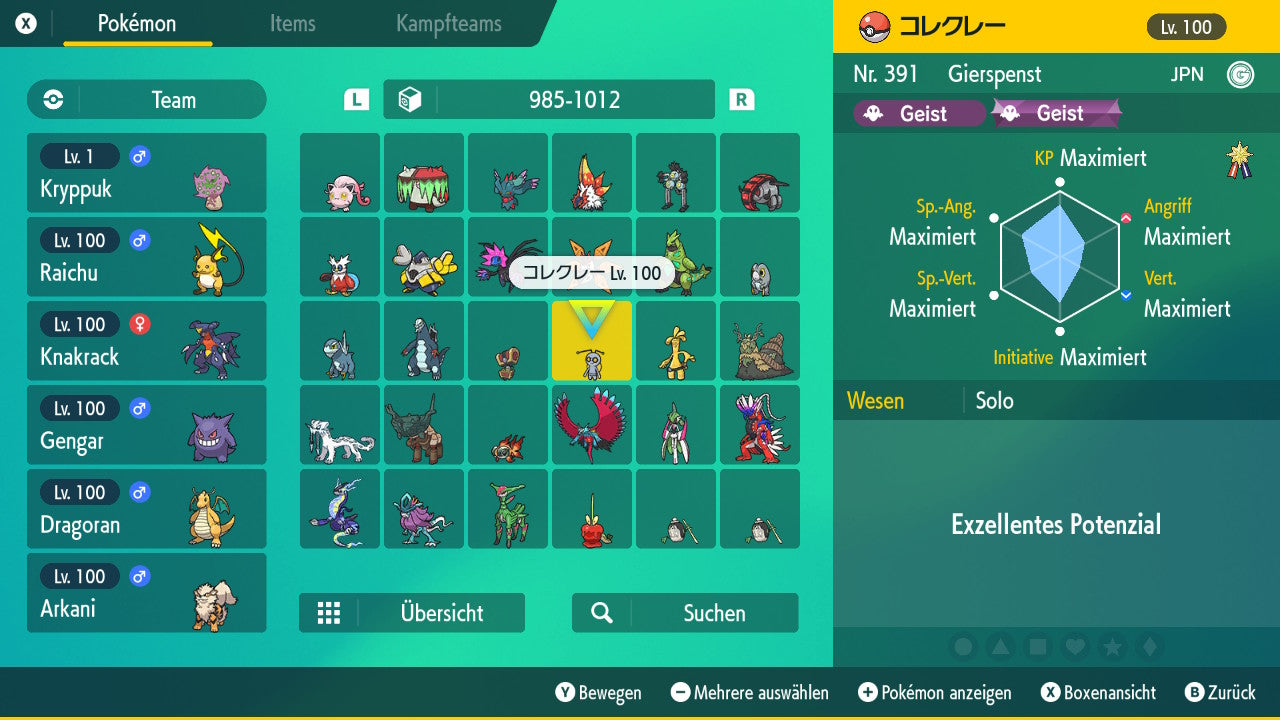 Das Pokemon ist mit beeindruckenden 6×31 IV-Werten ausgestattet. Das bedeutet, dass es auf allen sechs Werten (KP, Ang., Sp-Ang., Vert., Sp-Vert., Init.) die maximalen 31 IV/DV-Punkte besitzt. Dein Pokemon startet somit mit herausragender Stärke in digitale Kämpfe.