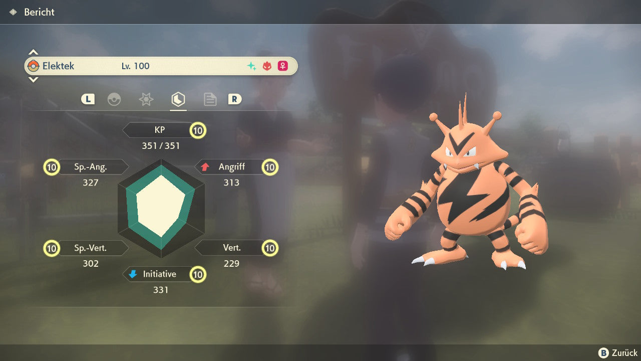 Das Pokemon ist mit beeindruckenden 6×31 IV-Werten ausgestattet. Das bedeutet, dass es auf allen sechs Werten (KP, Ang., Sp-Ang., Vert., Sp-Vert., Init.) die maximalen 31 IV/DV-Punkte besitzt. Dein Pokemon startet somit mit herausragender Stärke in digitale Kämpfe.
