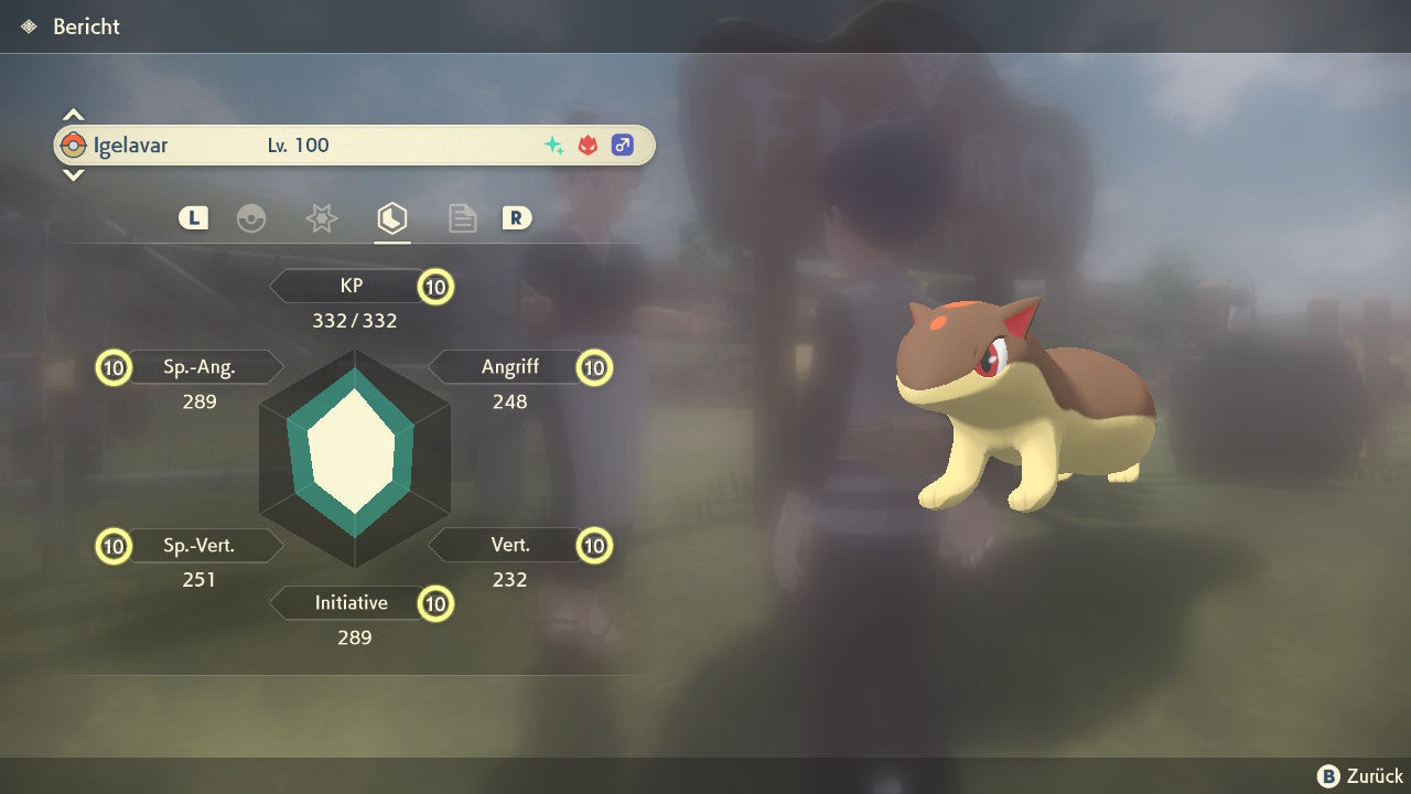 Das Pokemon ist mit beeindruckenden 6×31 IV-Werten ausgestattet. Das bedeutet, dass es auf allen sechs Werten (KP, Ang., Sp-Ang., Vert., Sp-Vert., Init.) die maximalen 31 IV/DV-Punkte besitzt. Dein Pokemon startet somit mit herausragender Stärke in digitale Kämpfe.