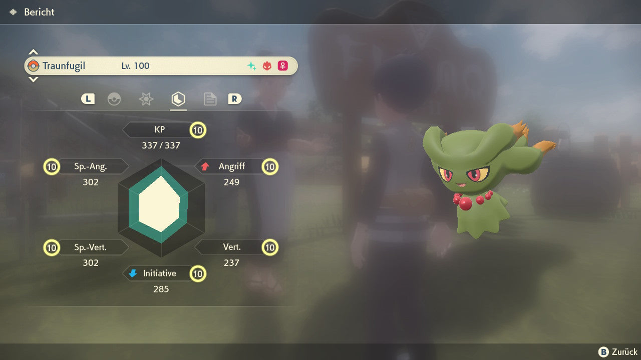 Das Pokemon ist mit beeindruckenden 6×31 IV-Werten ausgestattet. Das bedeutet, dass es auf allen sechs Werten (KP, Ang., Sp-Ang., Vert., Sp-Vert., Init.) die maximalen 31 IV/DV-Punkte besitzt. Dein Pokemon startet somit mit herausragender Stärke in digitale Kämpfe.