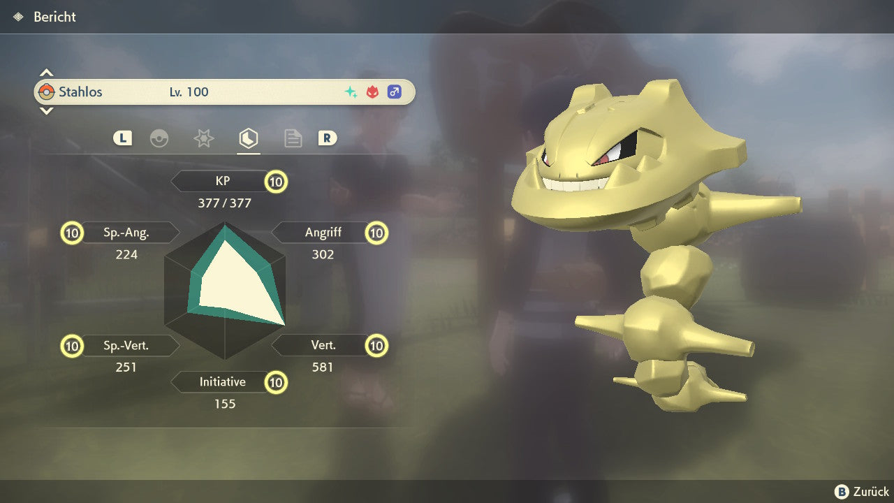 Das Pokemon ist mit beeindruckenden 6×31 IV-Werten ausgestattet. Das bedeutet, dass es auf allen sechs Werten (KP, Ang., Sp-Ang., Vert., Sp-Vert., Init.) die maximalen 31 IV/DV-Punkte besitzt. Dein Pokemon startet somit mit herausragender Stärke in digitale Kämpfe.