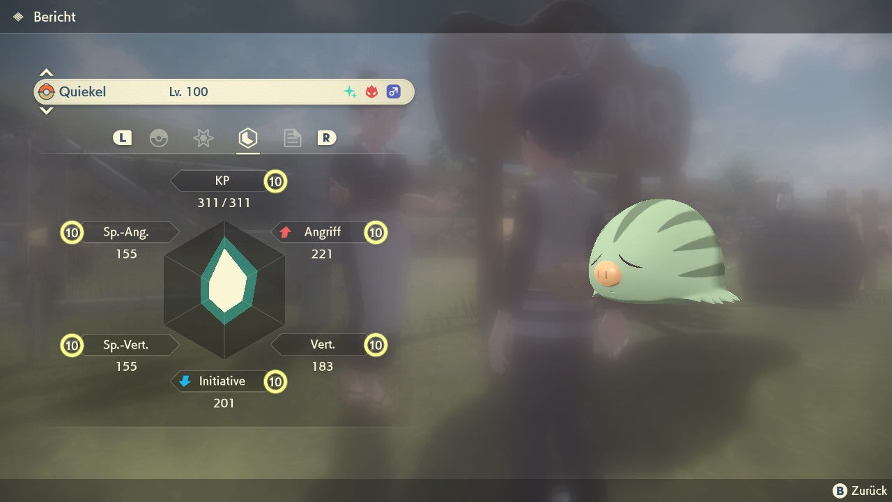 Das Pokemon ist mit beeindruckenden 6×31 IV-Werten ausgestattet. Das bedeutet, dass es auf allen sechs Werten (KP, Ang., Sp-Ang., Vert., Sp-Vert., Init.) die maximalen 31 IV/DV-Punkte besitzt. Dein Pokemon startet somit mit herausragender Stärke in digitale Kämpfe.