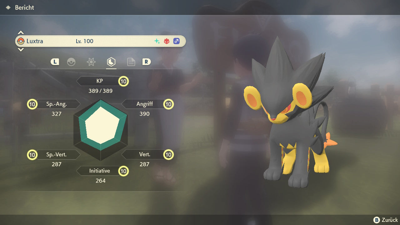 Das Pokemon ist mit beeindruckenden 6×31 IV-Werten ausgestattet. Das bedeutet, dass es auf allen sechs Werten (KP, Ang., Sp-Ang., Vert., Sp-Vert., Init.) die maximalen 31 IV/DV-Punkte besitzt. Dein Pokemon startet somit mit herausragender Stärke in digitale Kämpfe.